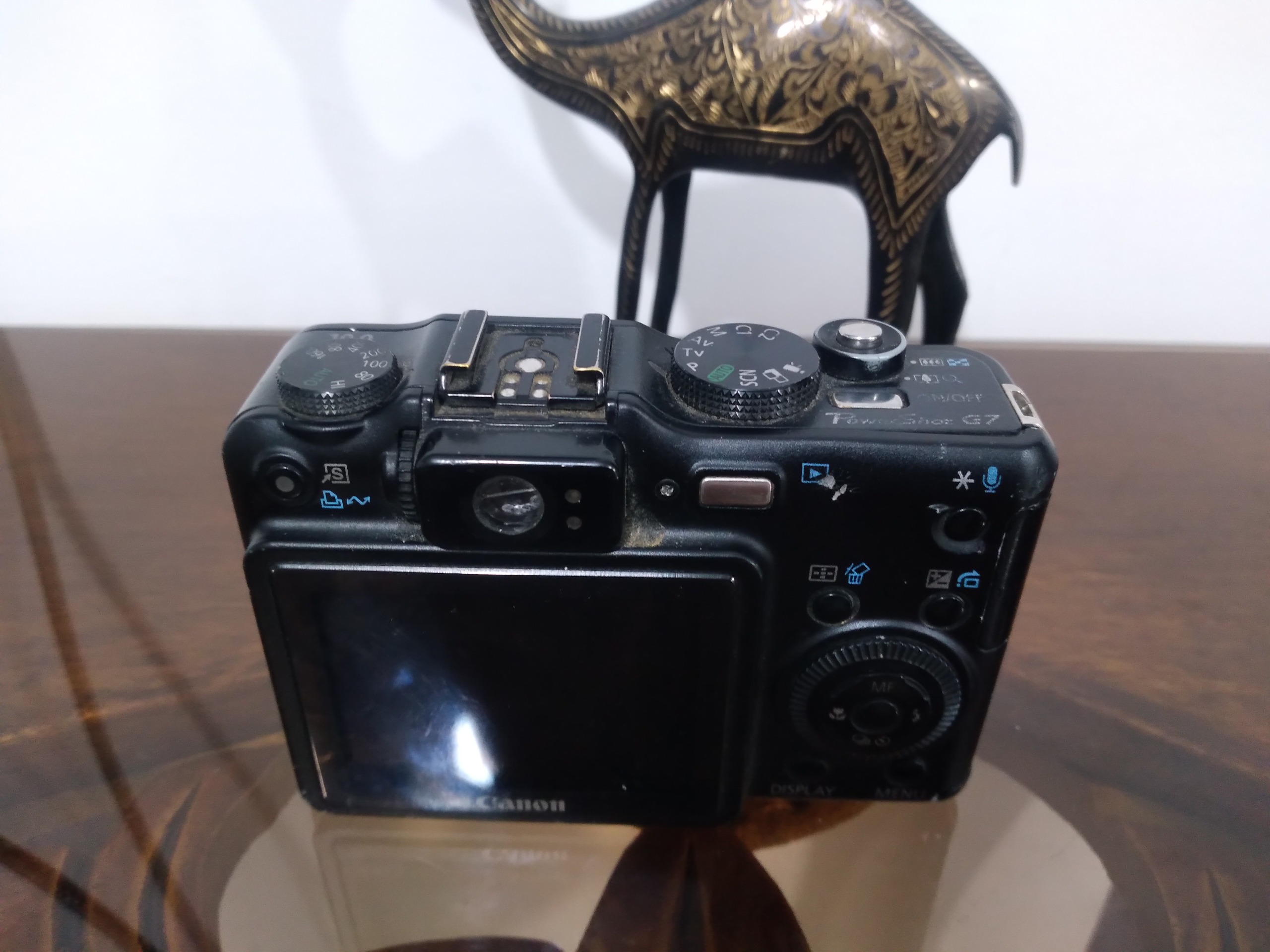 دوربین g7کنون دارای باتری بدون شارژرولوازم جانبی .تاحدودی خط وخش دارد.فقط مشکلی که داره اینه که تصویر نمیده .صفحه نمایش سالمه .اماتصویرلنز سیاه است .ظاهرایه قطعه داخلش خرابه.سنسور: 1/1.8 اینچ اندازه CCD با رزلوشن 10میلیون پیکسل