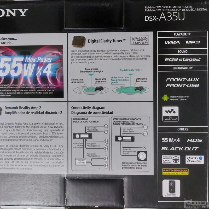 رادیو پخش سونی فلش خور یک دین با پنل جدا شونده در حد نو با قدرت زیاد (55W) و چهار خروجی باند. سی دی خور نیست و چون درمشخصات پیش فرض ایسام این نوع دستگاه نبود ذکر شده است. ساخت تایلند. خط و خش بسیا جزیی دارد. لوازم همراه فقط دفترچه راهنما و قاب نگهداری پنل جدا شونده را دارد.