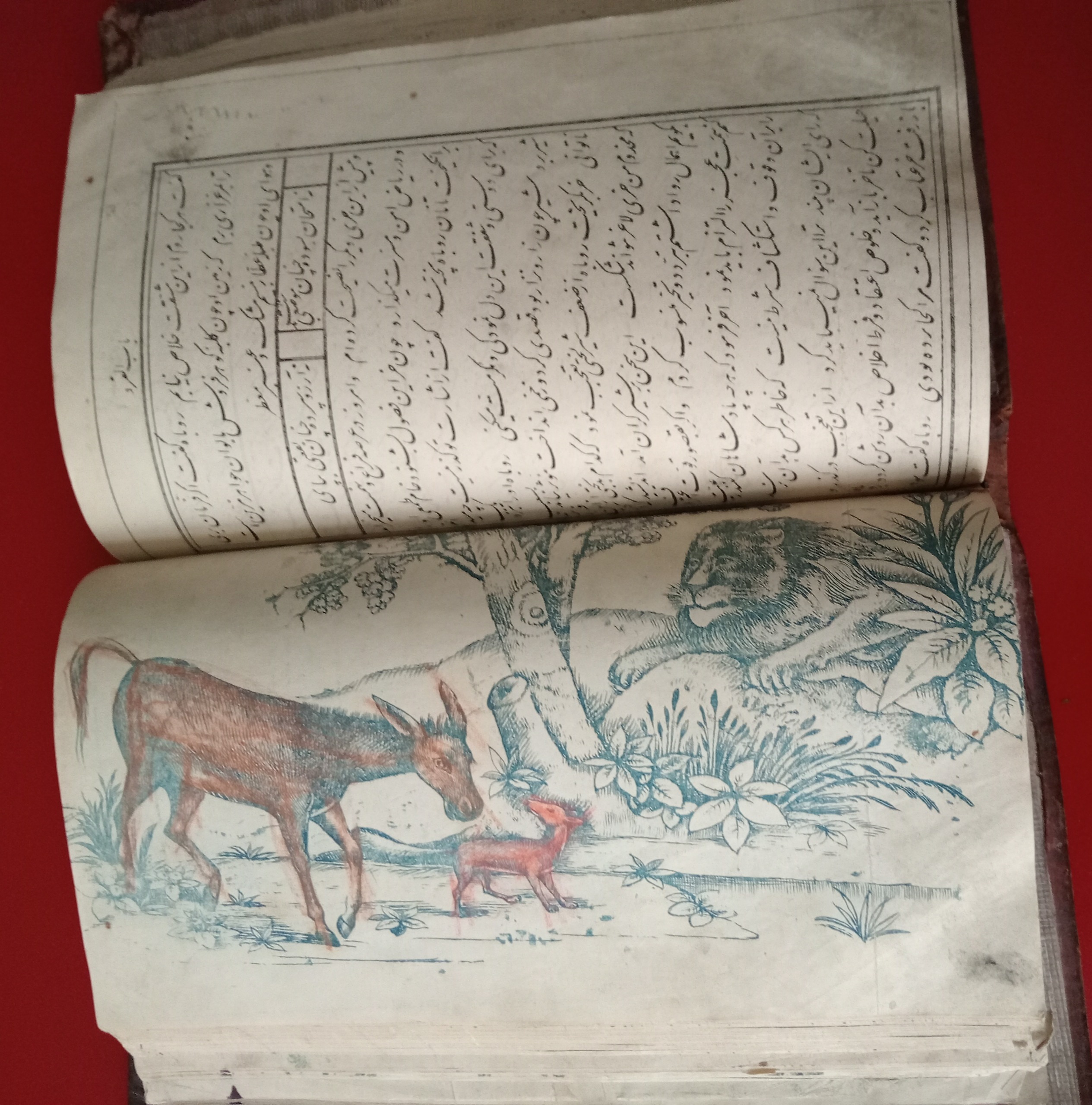 کتاب ادبی کلیه و دمنه نخستین چاپ در ایران و در زمانی حدود 140 سال پیش با مهر علیقلی میرزا اعتضاد السلطنه وزیر علوم و مطبوعات ناصر الدین شاه.کتاب تصویر دار است و با جلد چرمی و سخت با کاغذ نفیس زمان خود به چاپ رسیده است. از لحاظ کتاب در شرایط خوبی می باشد.