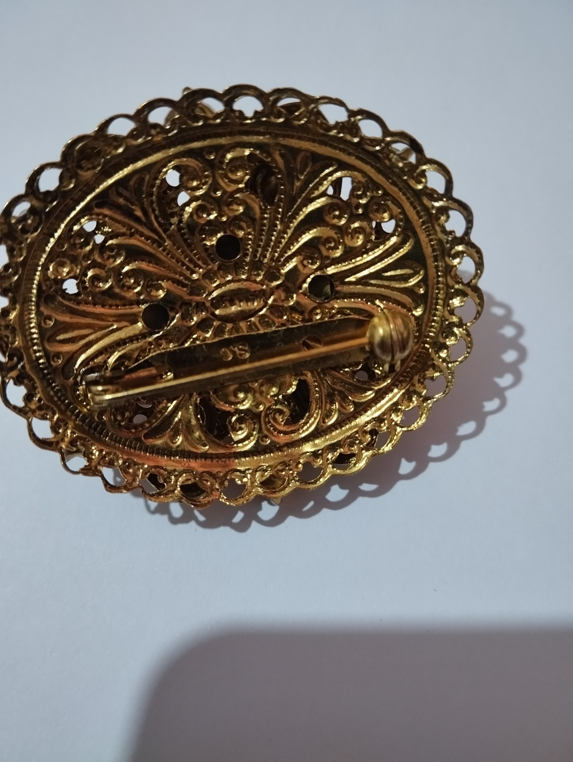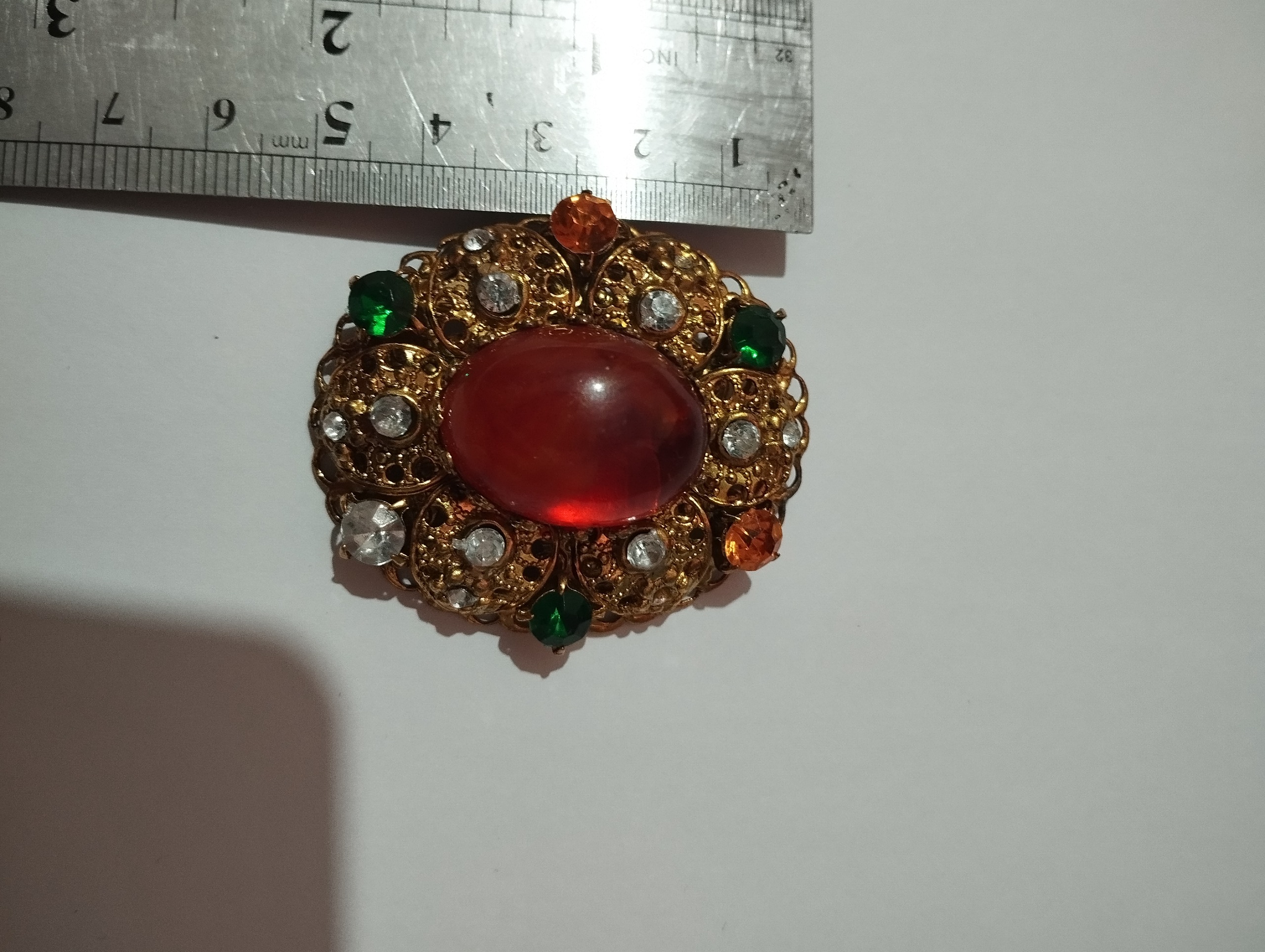 گل سینه تغریبا جدید و نو استفاده نشده با نگین های نمیدونم رزین یا پلاستیک شیشه نیست و لی به هرحال خیلی زیباست با پایه برنج