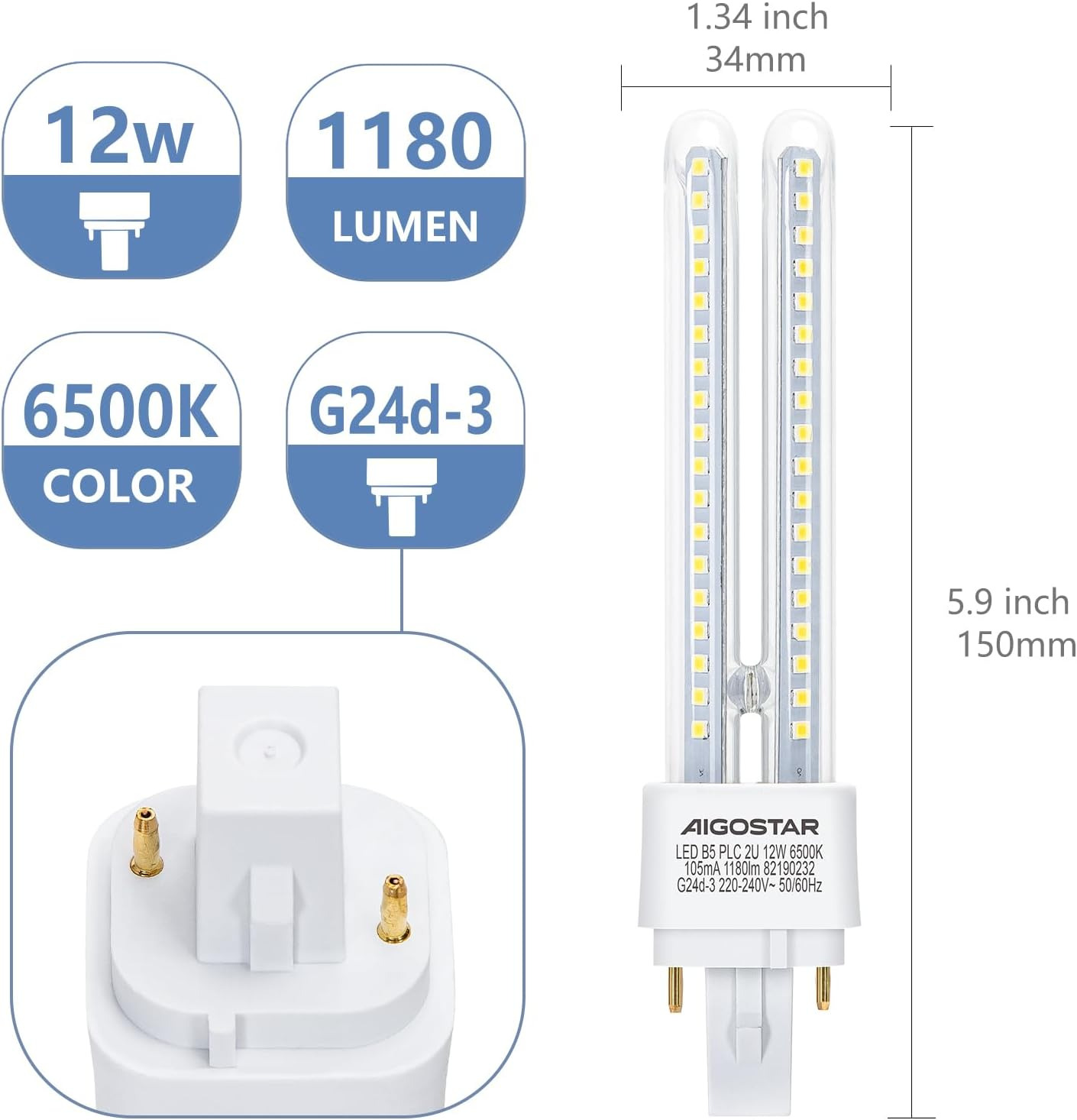 Aigostar -  لامپ LED 12W 2U PLC G24d-3، نور سفید خنک 6500K، 1180 لومن.