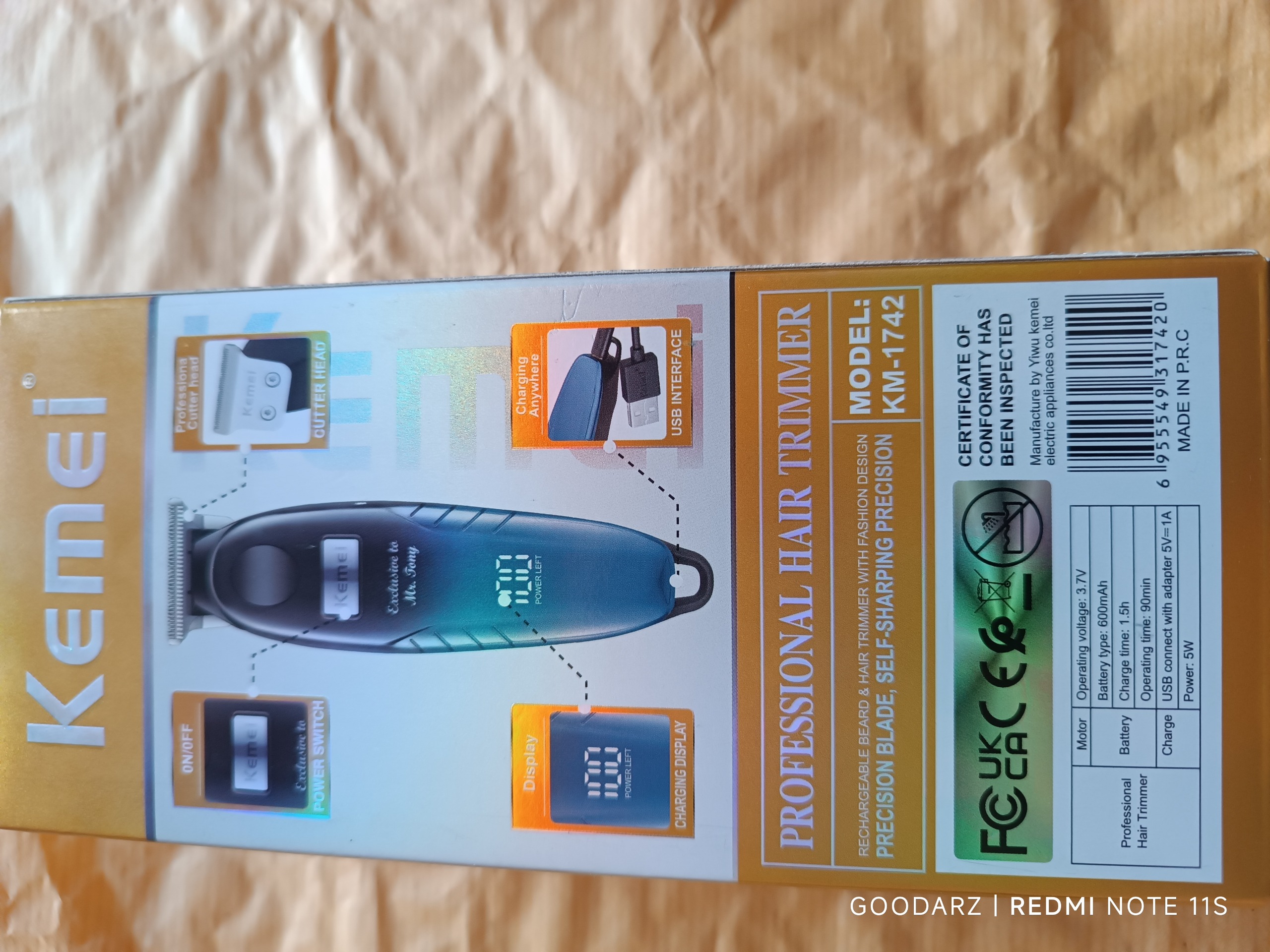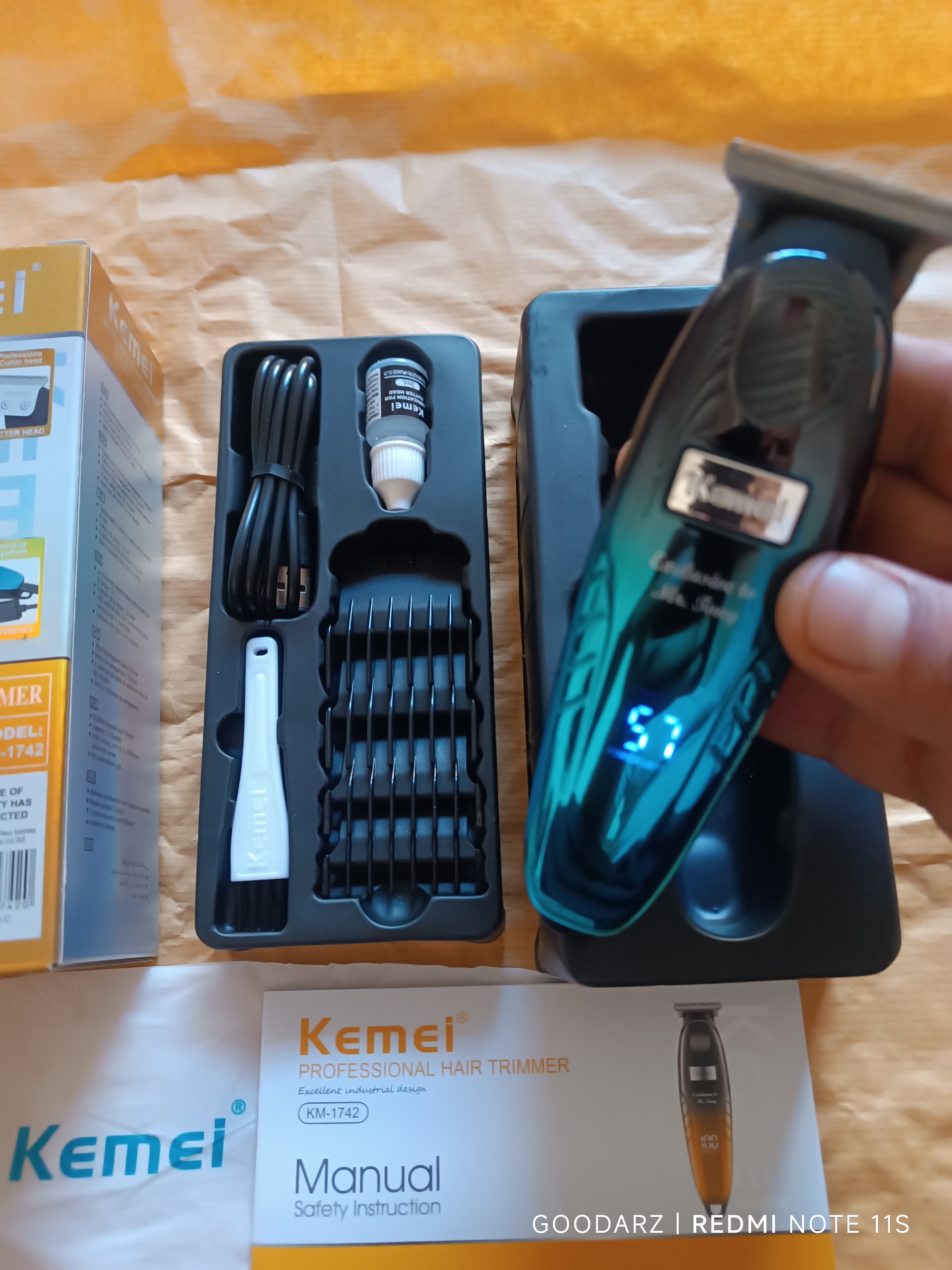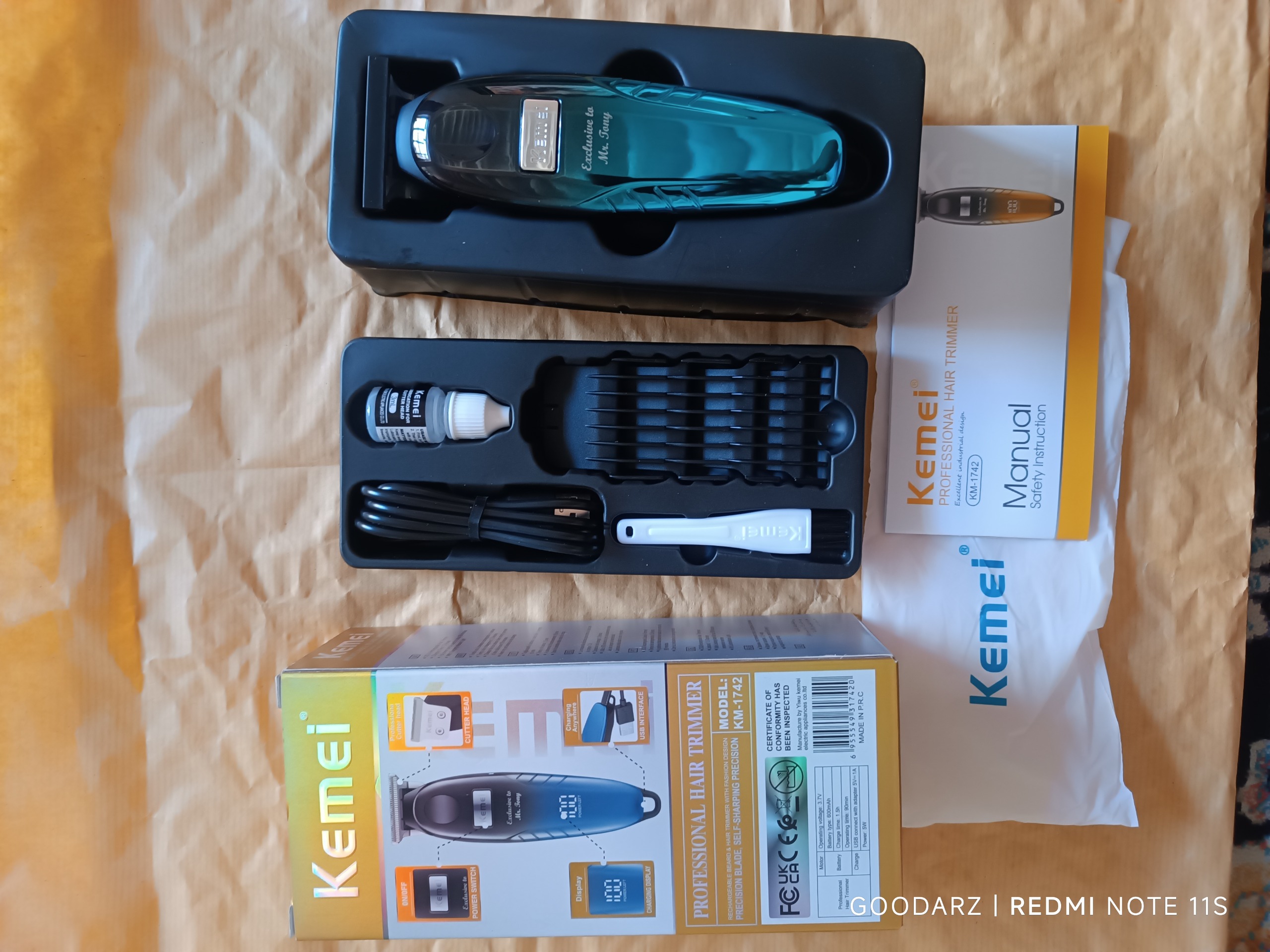 ماشین اصلاح 1742 کیمی خط زن و اصلح صورت و بدن به همراه متعلقات چهار عدد شانه از شماره 1،5 3 4،5 6 و کابل شارژ و روغن و برس