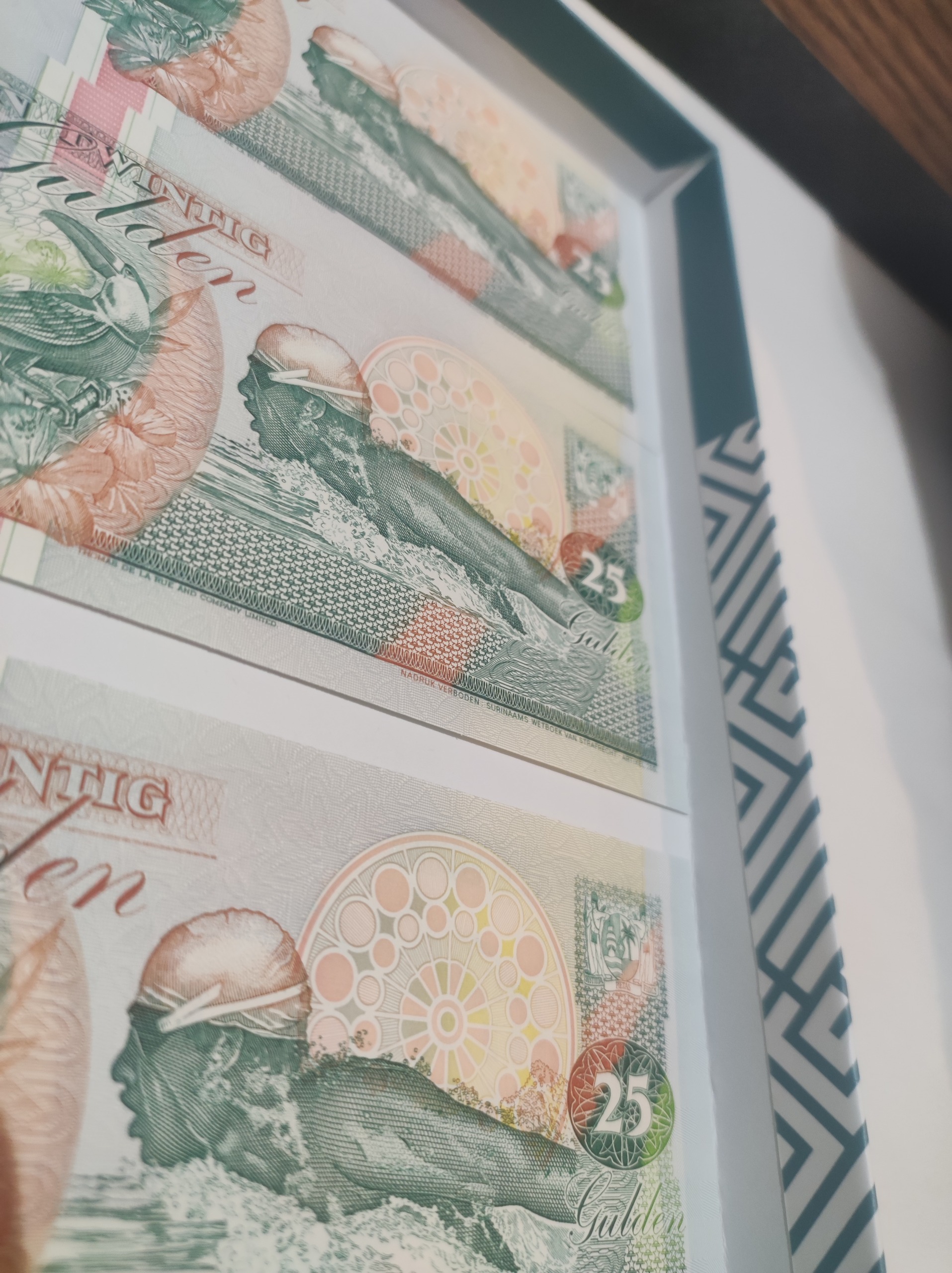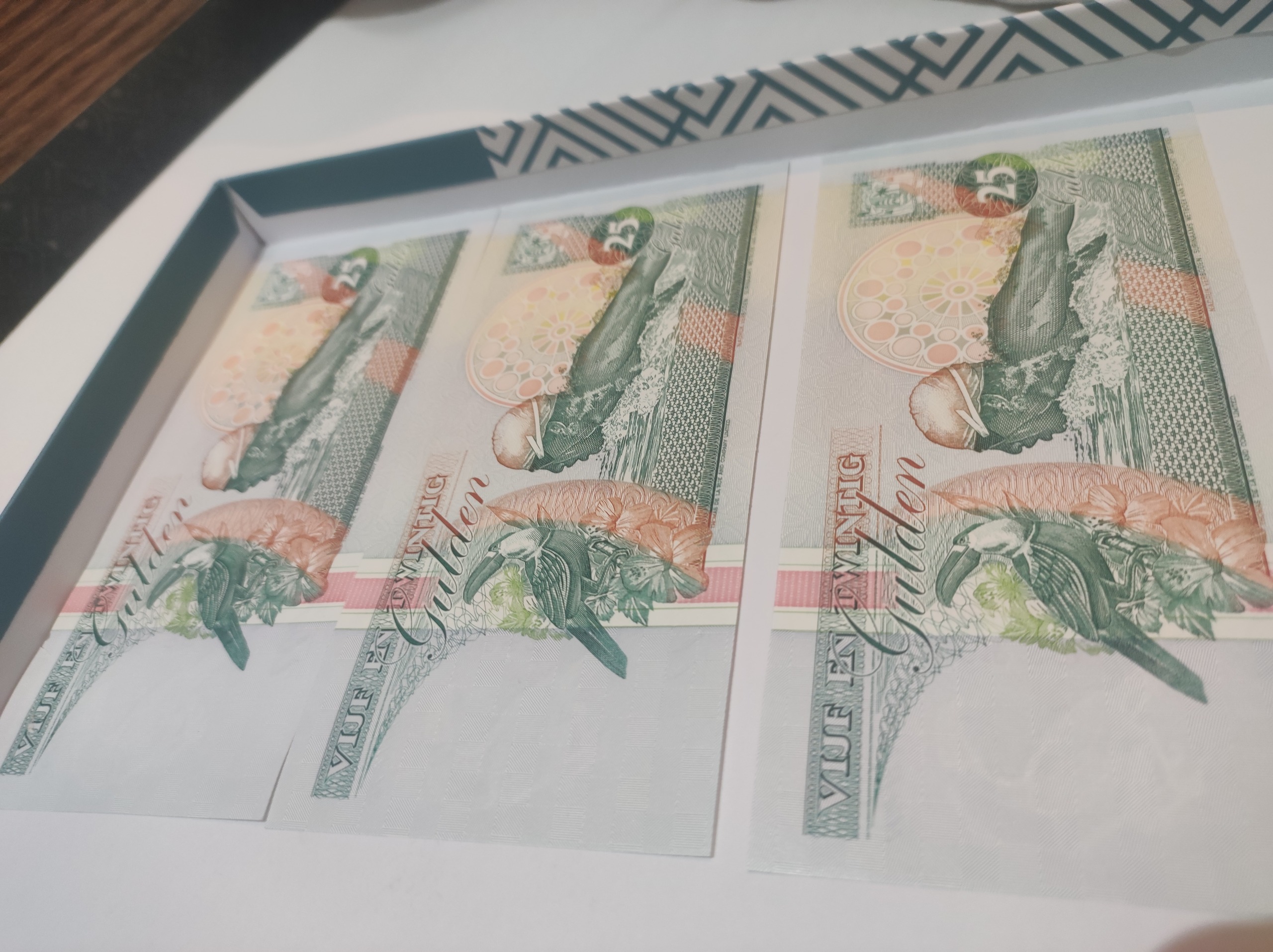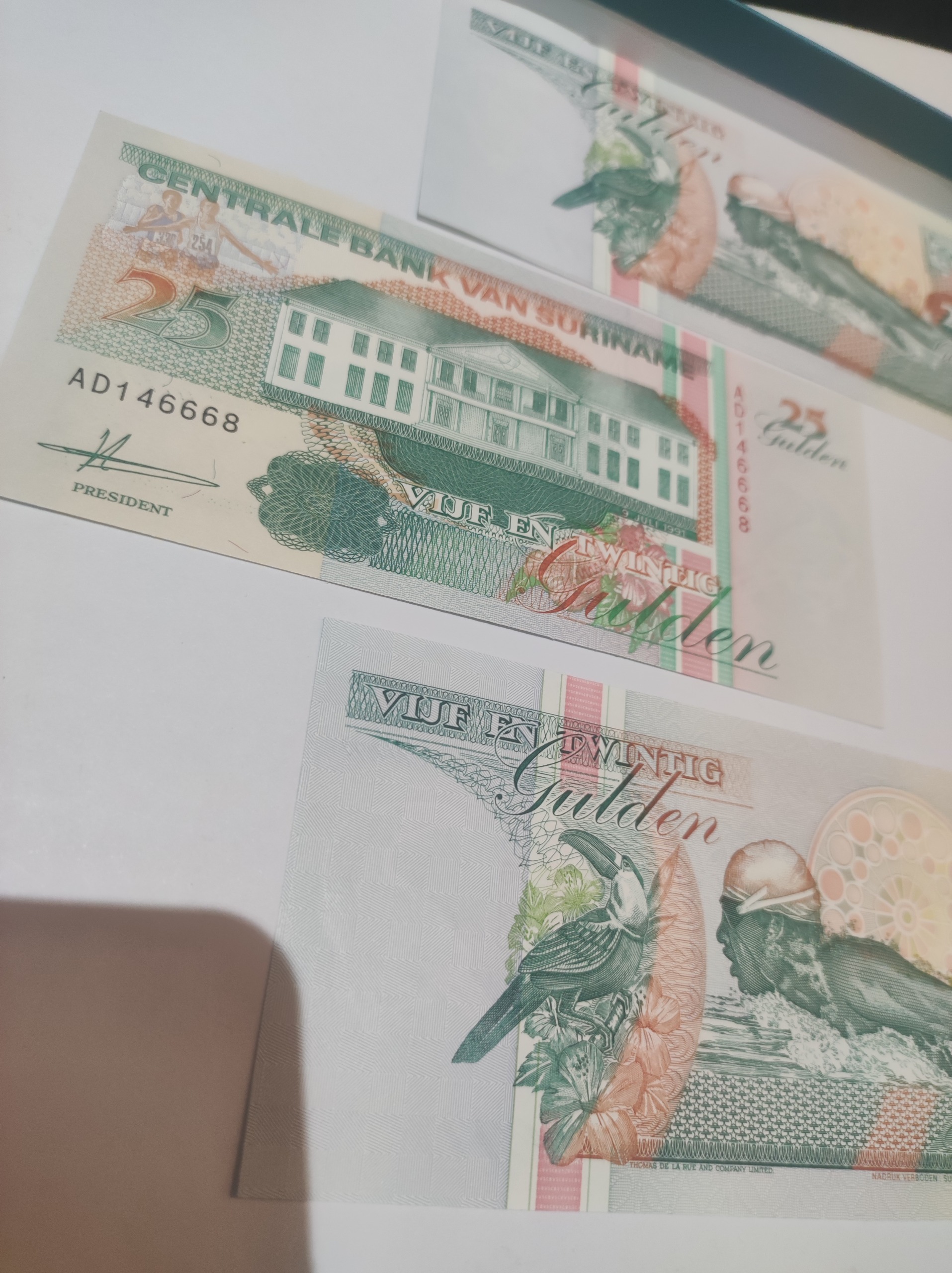 اسکناس همواره تخفیف و تابلویی مخصوص شناگران ،با ارزش و کمیاب 25 گیلدن سورینام از توابع هلند سه عدد موجود یکی پارگی دارد که قیمت آن بخاطر پارگی که البته اصلا معلوم نیست چون اسکناس نو نو بوده است آقا قیمت دارد .ولی دو تا نو هم ازش باقیه