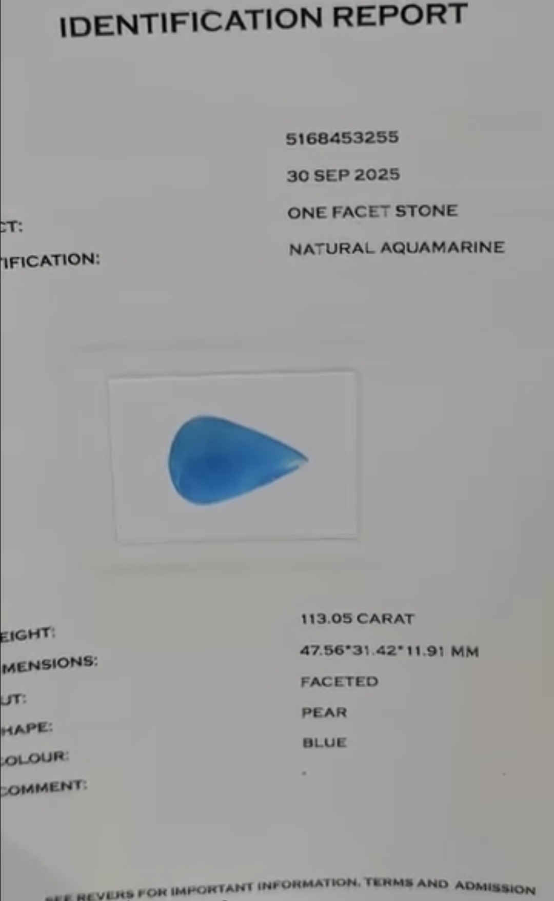 آکوامارین غولپیکر معدنی 113 قیراطی شناسنامه دار