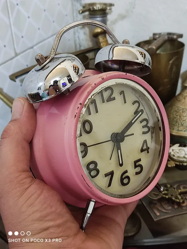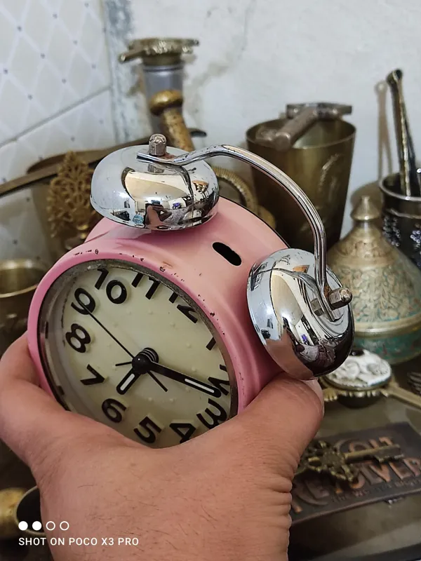 یک عدد ساعت رومیزی تمام فلز این ساعت جدیده ولی طرح ساعتای قدیمی ساخته شده با این تفاوت که اونا کوکی هست و این باتری قلمی میخوره این ساعت خیلی خیلی تمیزه تمیز و سالم اما یه عیب نسبتا کوچیک داره بیلبیلک بالای ساعت که کار صدای زنگشو انجام میداده نداره فقط یه بیلبیلک میخواد که بذاری روش ساعت سالمه کار میکنه الان ظاهرشم بسیار تمیزه