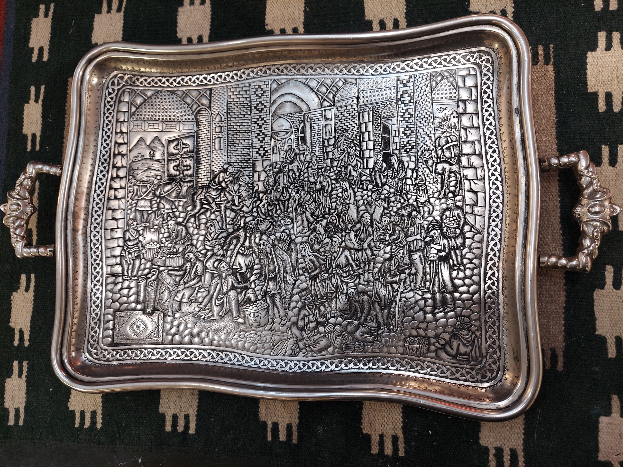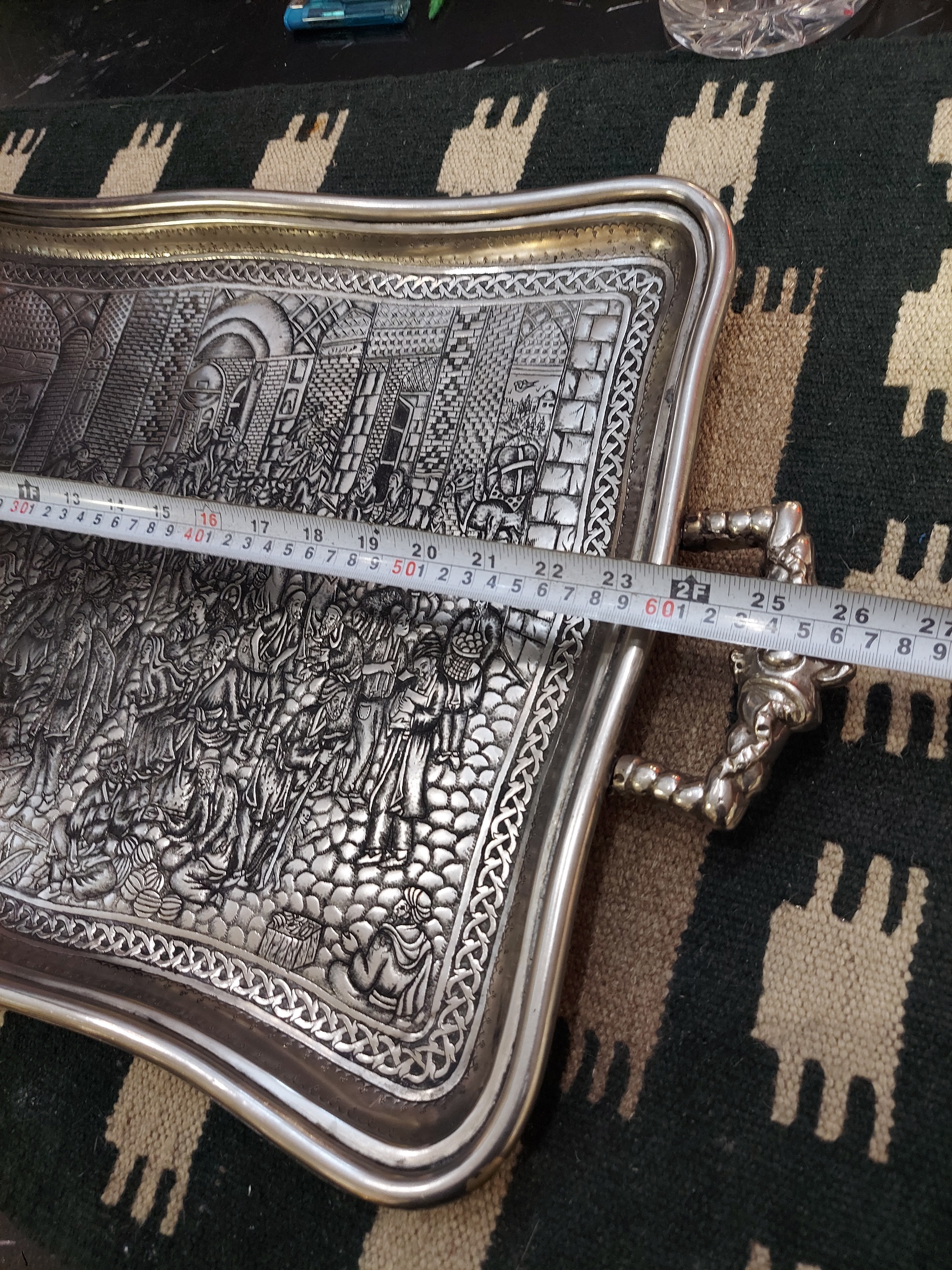 سینی نوربلین و 100 ساله است به طول 67 سانت دسته تا دسته و وزن سنگین بیش از سه و نیم کیلو و قلم هم جدید و اثر استاد وفایی هست کار مهر و امضادار بازار صفوی به ظرافت و زیبایی ریزه قلم کار شده کاملا سالم