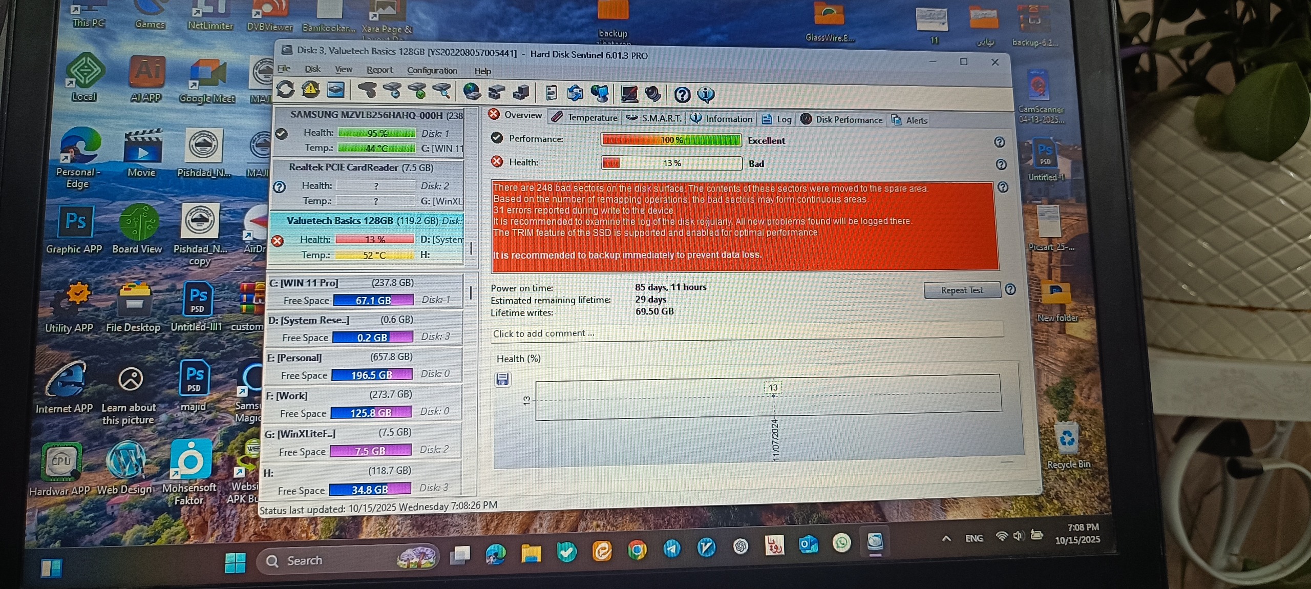 هارد SSD Value Tech 128gb سلامت پایین