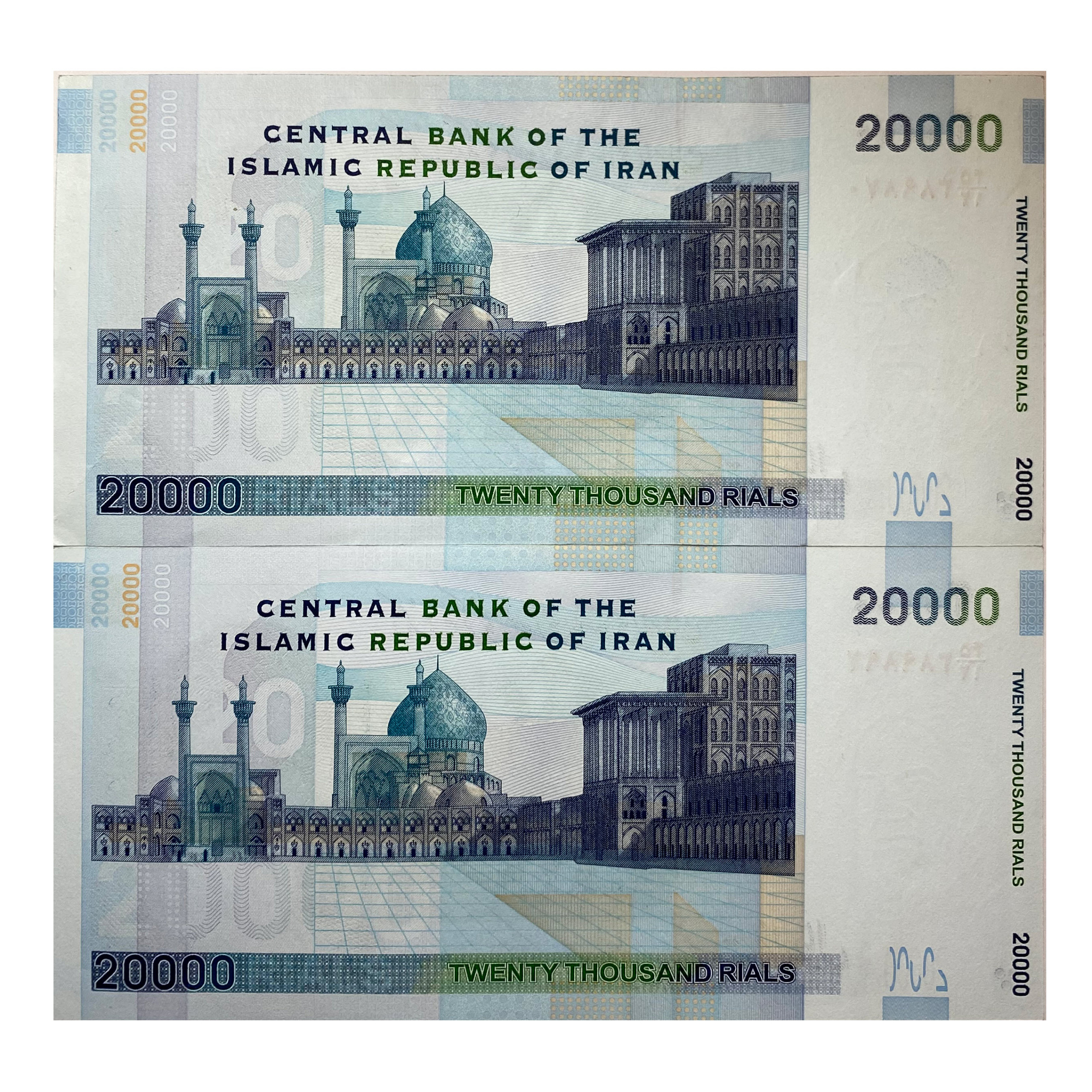 یک جفت ( 2 تک) اسکناس 2 هزار تومنی با تصویر پشت میدان نقش جهان اصفهان، امضای دانش جعفری و شیبانی، دوره اوّل احمدی نژاد دارای 18 سال قدمت، شماره ها عین تصویر، از یک بسته هستند با چند شماره اختلاف، کیفیت در حد بانکی زدم چون دارای شکستگی گوشه است.