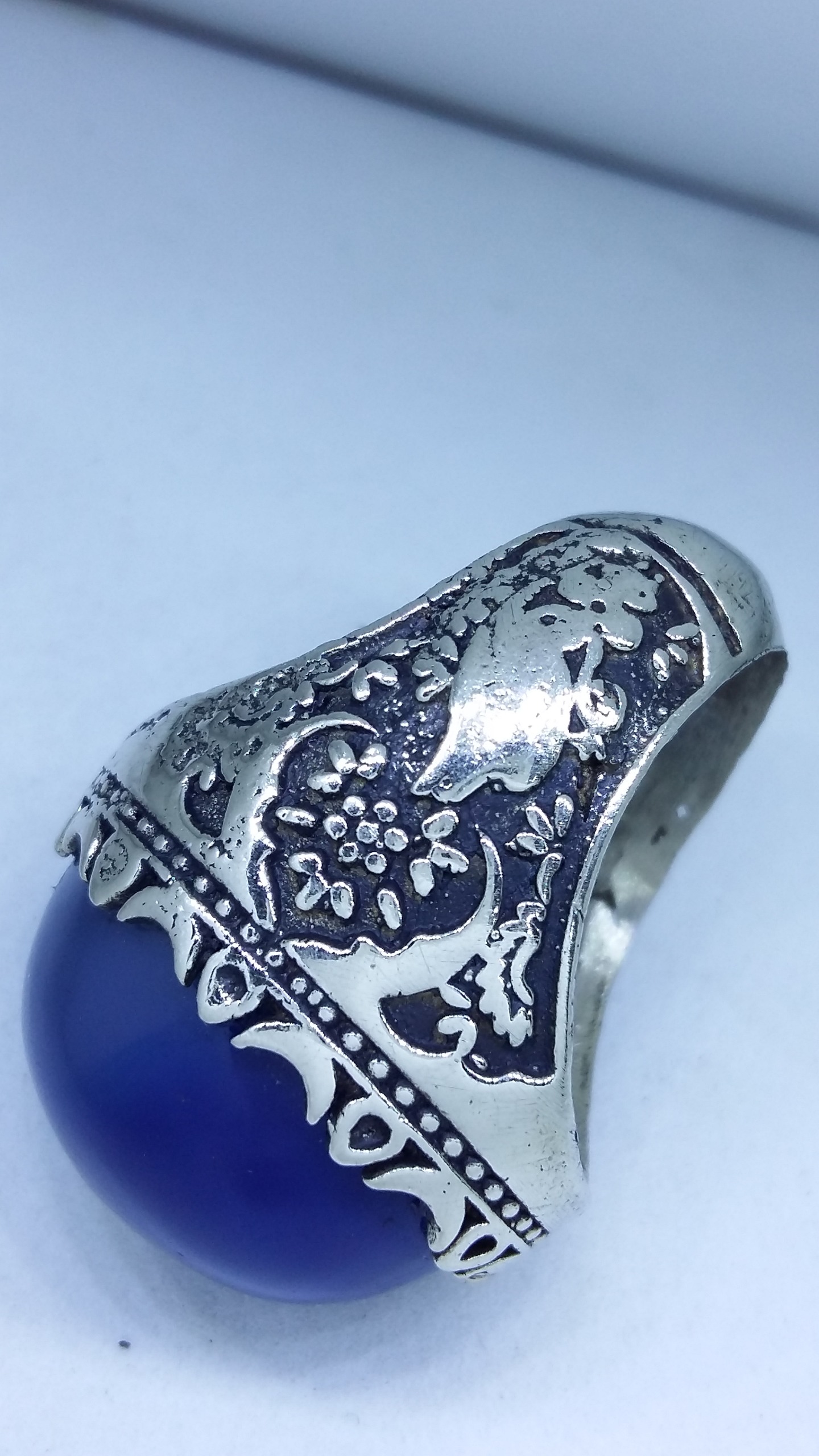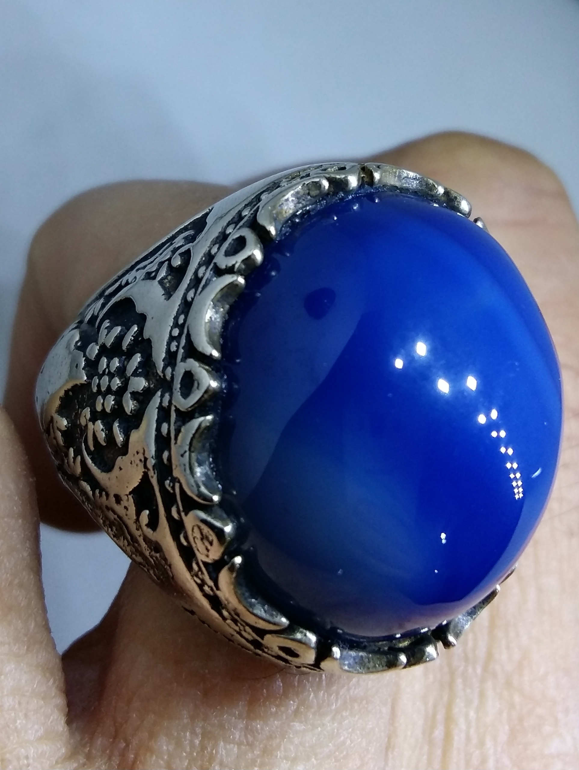 انگشتر قلمزنی شاهانه عقیق آبی بزرگ برزیلی اصیل
