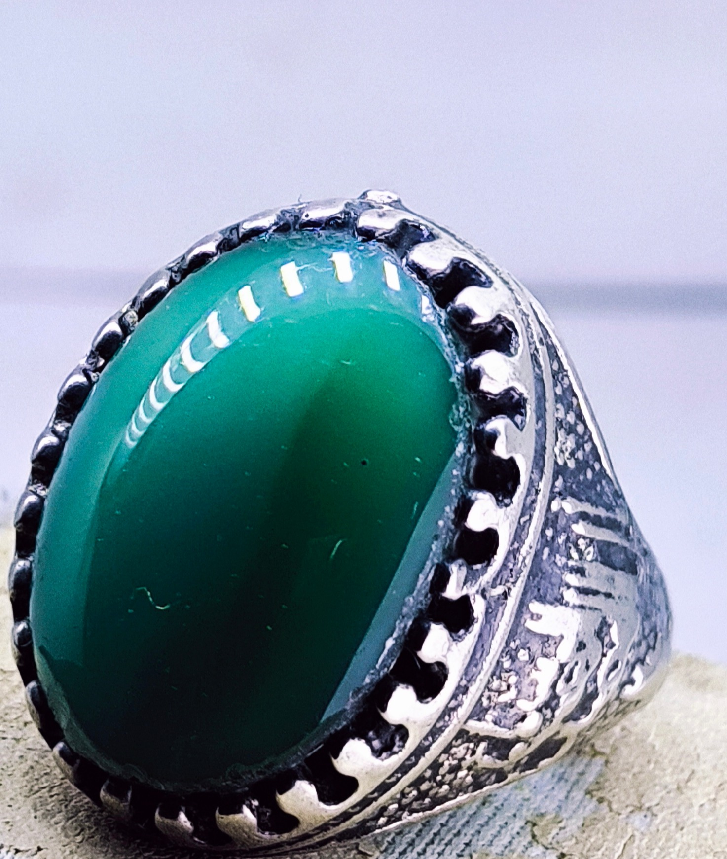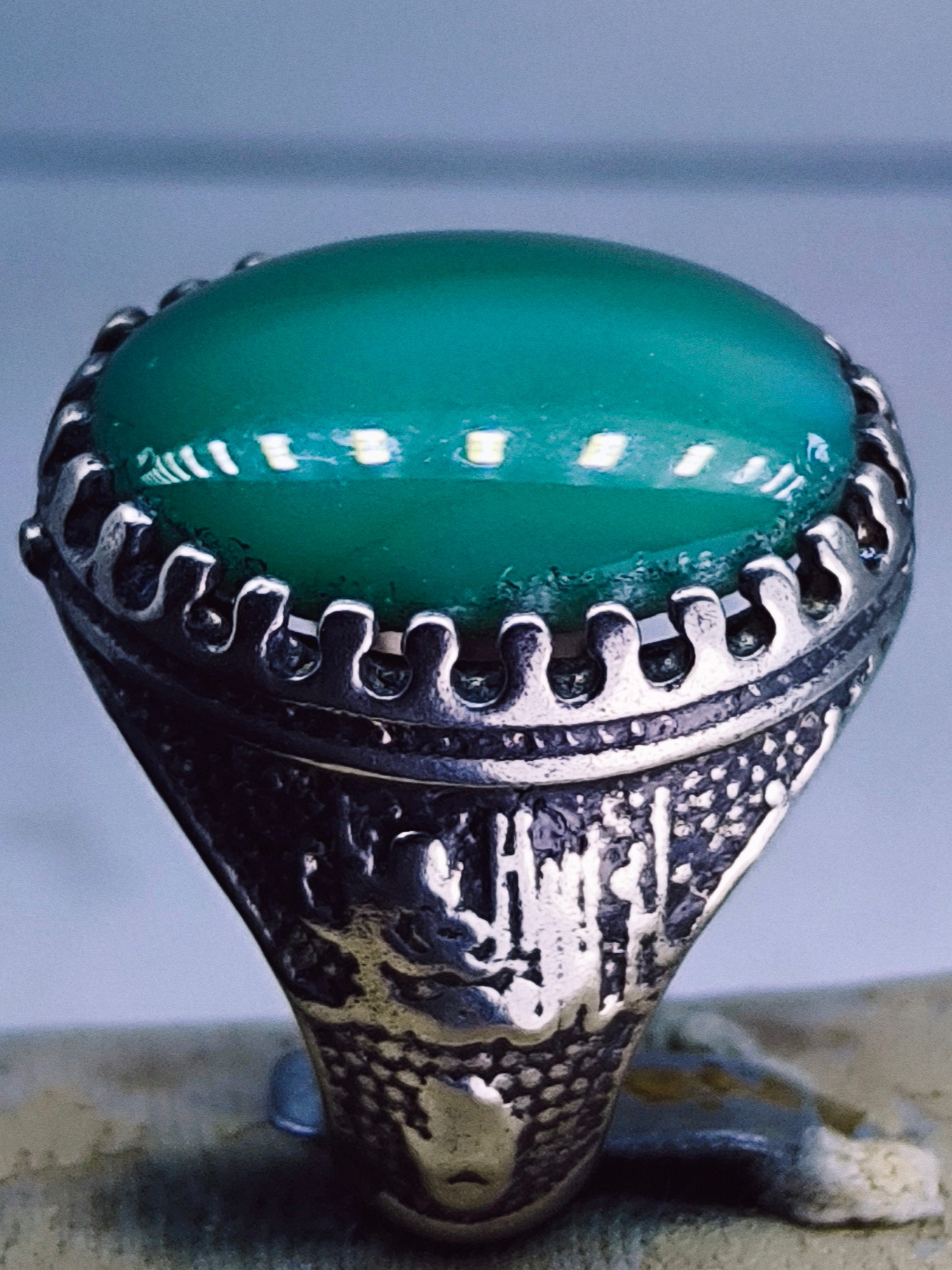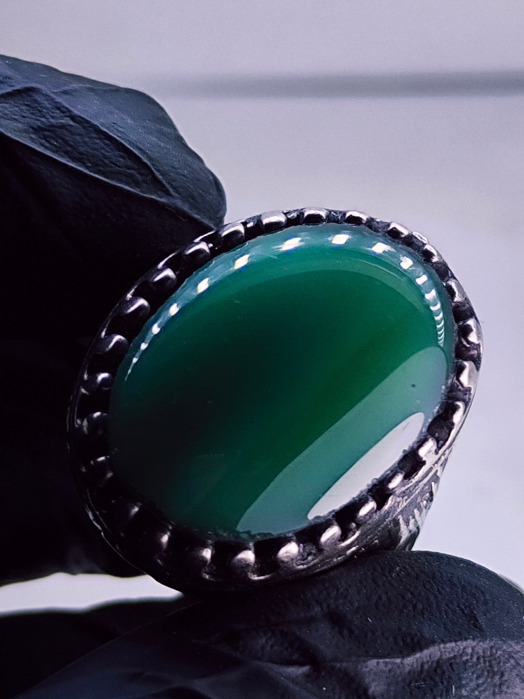 انگشتر لوکس آبدار عقیق سبز یمانی با تراش بکر عبدالرزاقی با هاله ای بینظیر سوار بر رکاب نقره طرحدار سایز 63