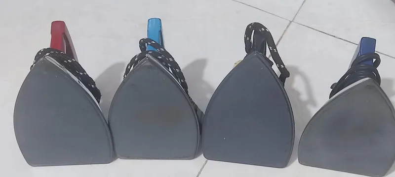 چهار دستگاه اتو کوچک قدیمی زیبا و کلکسیونی هر چهار تا کار میکنند یکی سیمش فابریک نیست همه داغ میشن اندازه حدود 12 سانت مارک ندارند