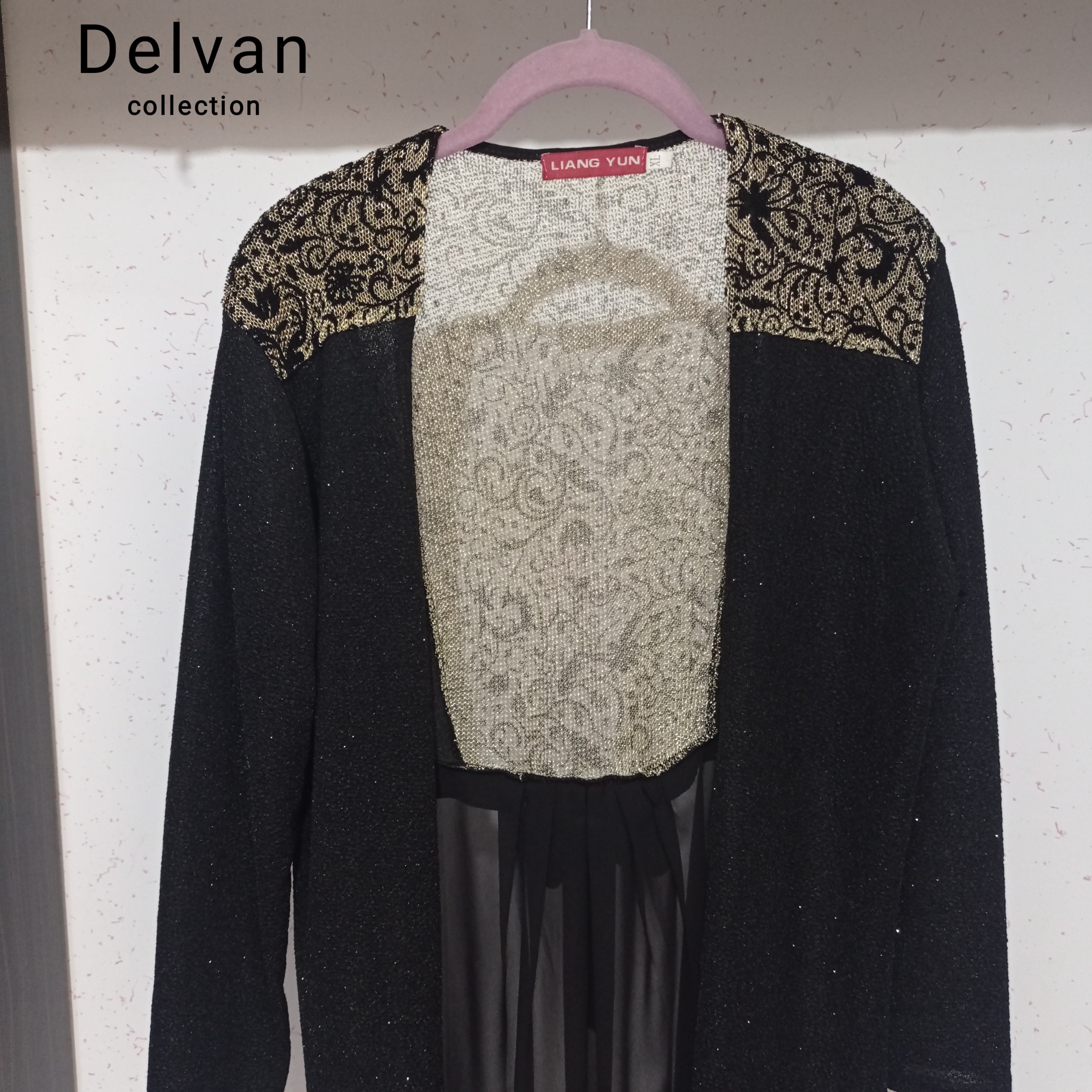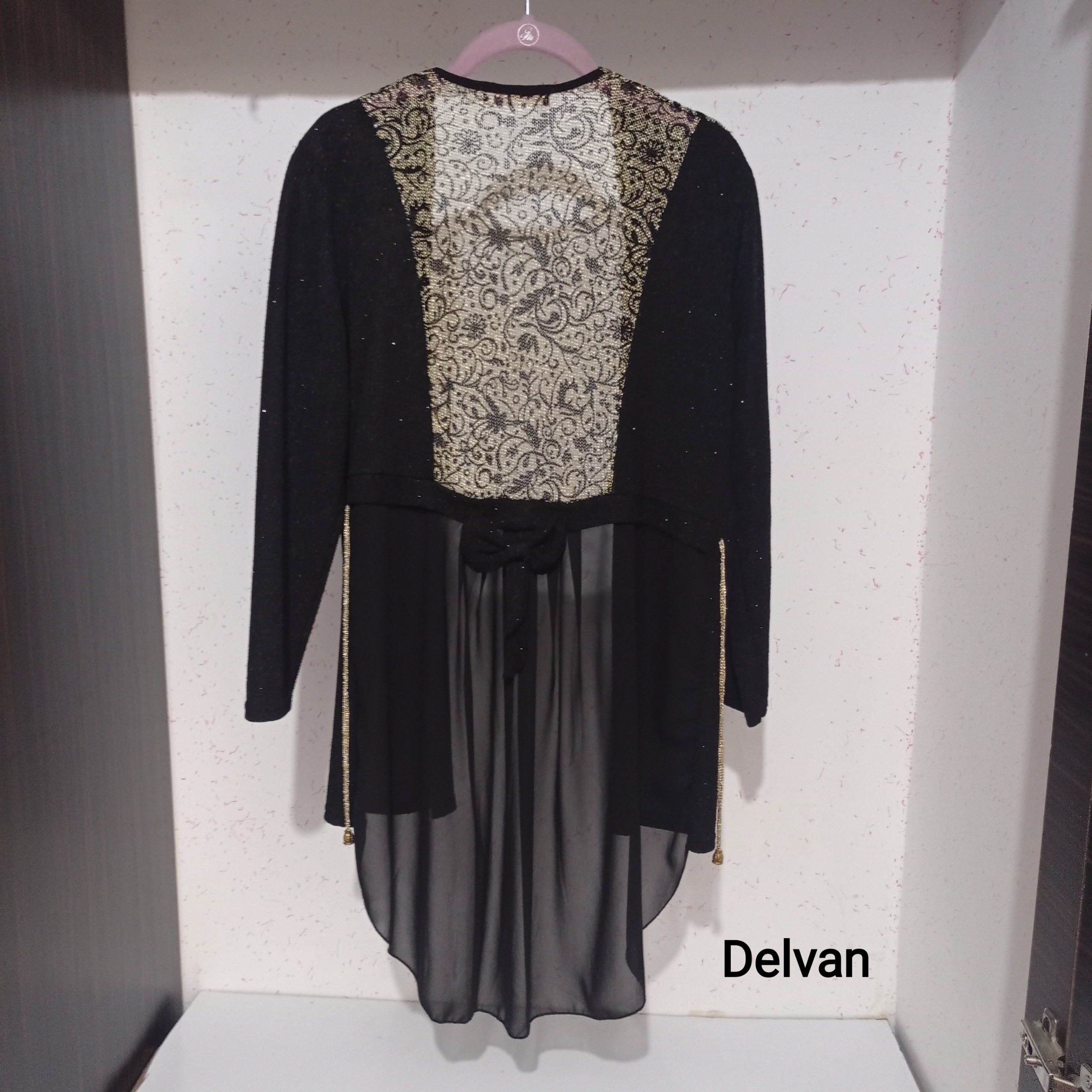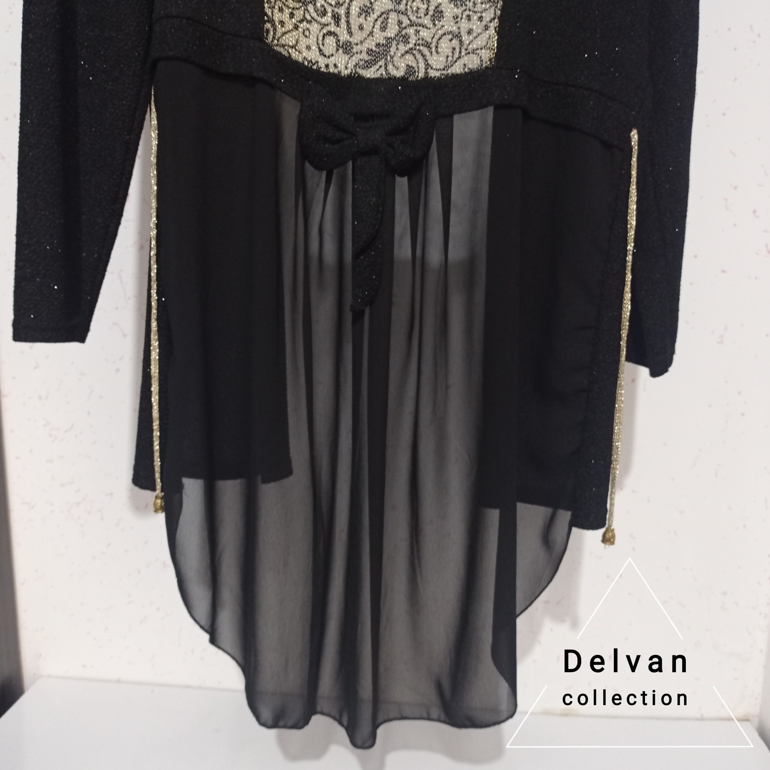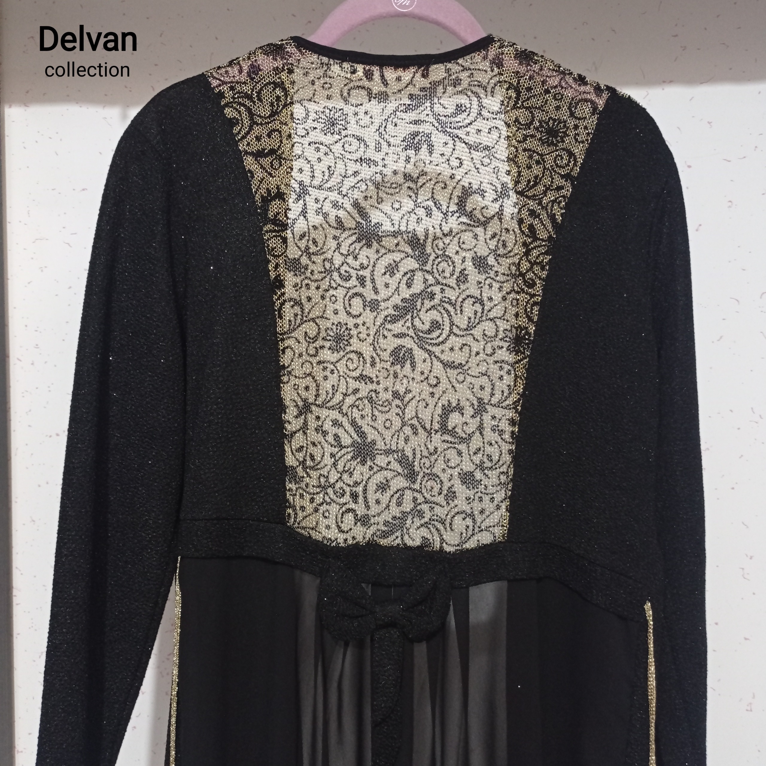 رویه لباس زنانه ، پارچه لمه ایی طلایی و مشکی شاین کشی ، پایین کار توری ، جلو باز ، مناسب سایز 36 تا 44