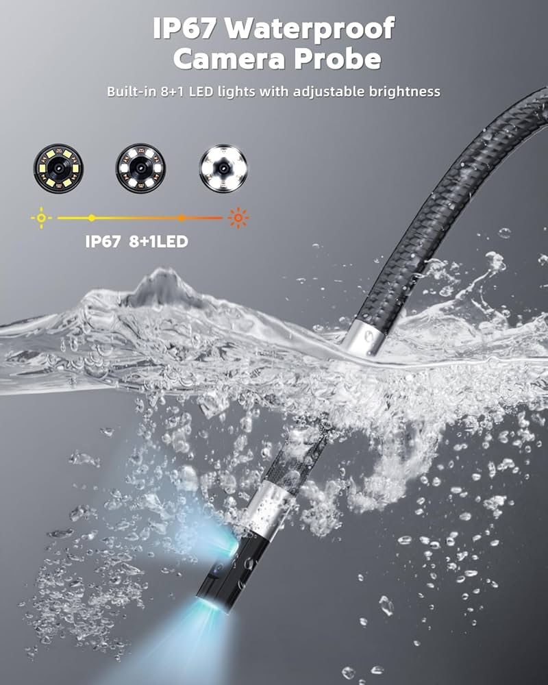 آندوسکوپی صنعتی ضد آب: دوربین آندوسکوپی ضد آب IP67 دارای 8 LED و روشنایی قابل تنظیم در سه سطح است تا تصاویر واضح را حتی در تاریکی و رطوبت تضمین کند. با ظرفیت بالای باتری، میتوان آن را به مدت 3-4 ساعت برای رفع نیازهای مختلف آزمایش شما کار کرد.