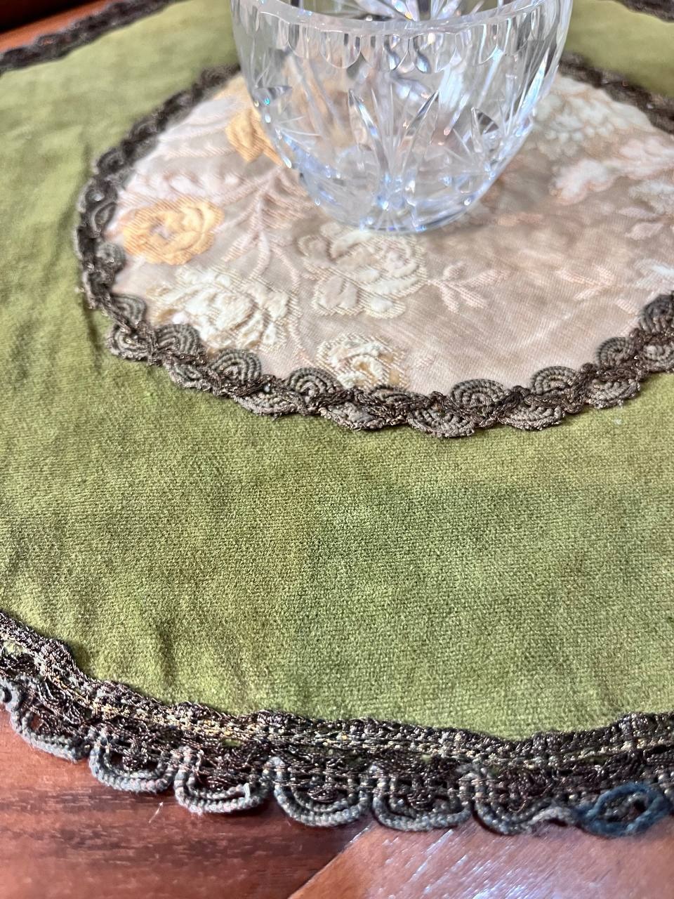 رومیزی سبز زیبای قدیمی ترکیب مخمل ساده و وسط گل برجسته با یراقهای سیمی زیبای قدیمی استر دار