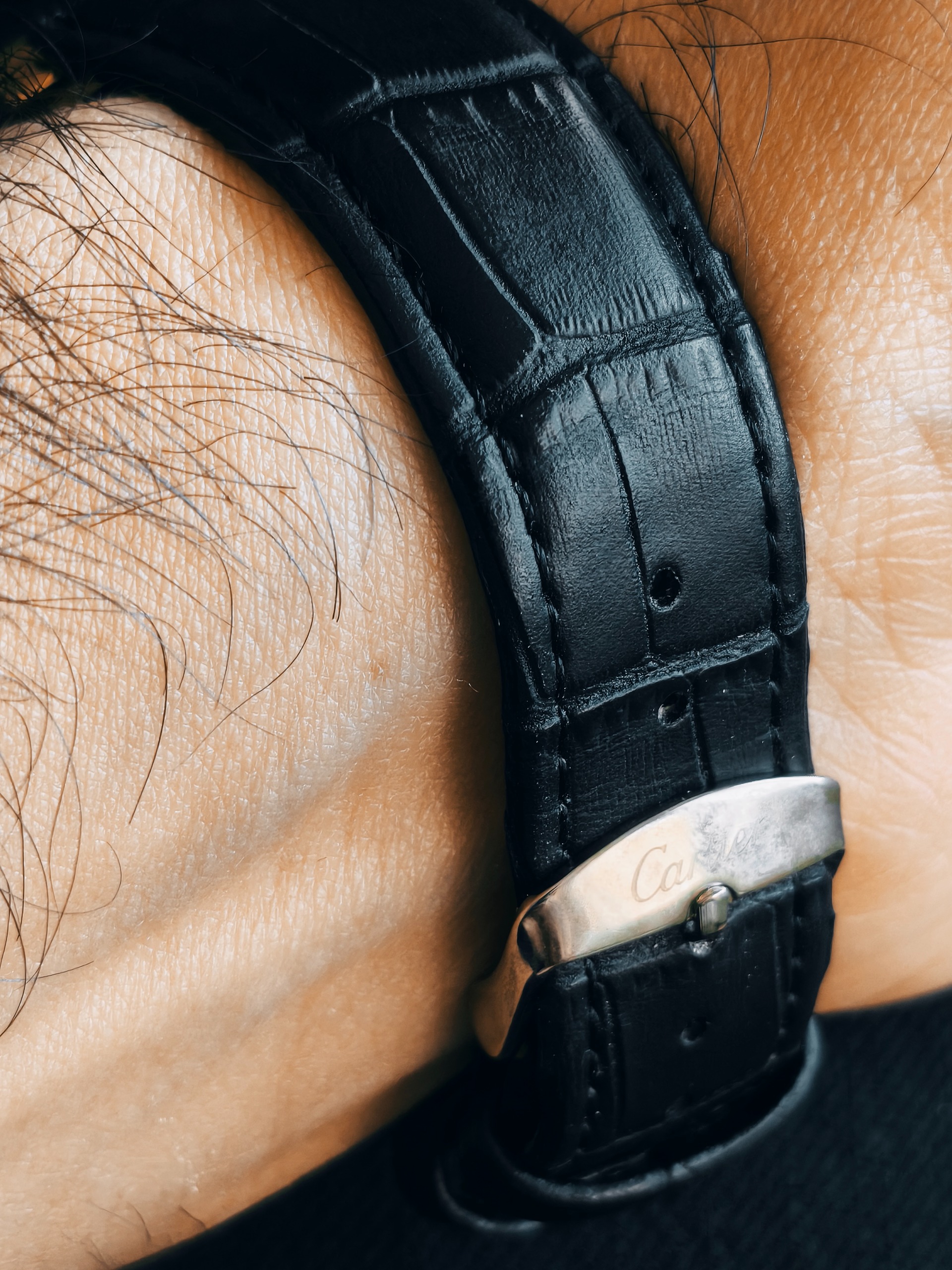 بند ساعت از **چرم طبیعی مشکی رنگ** با دوخت ظریف ساخته شده که هم دوام بالایی دارد و هم جلوهای شیک و رسمی به مچ دست میبخشد. مقاومت این مدل تا **50 متر در برابر آب (WR 50M)** بوده و برای استفاده روزمره، شستوشو یا قرار گرفتن در معرض باران کاملاً مناسب است.