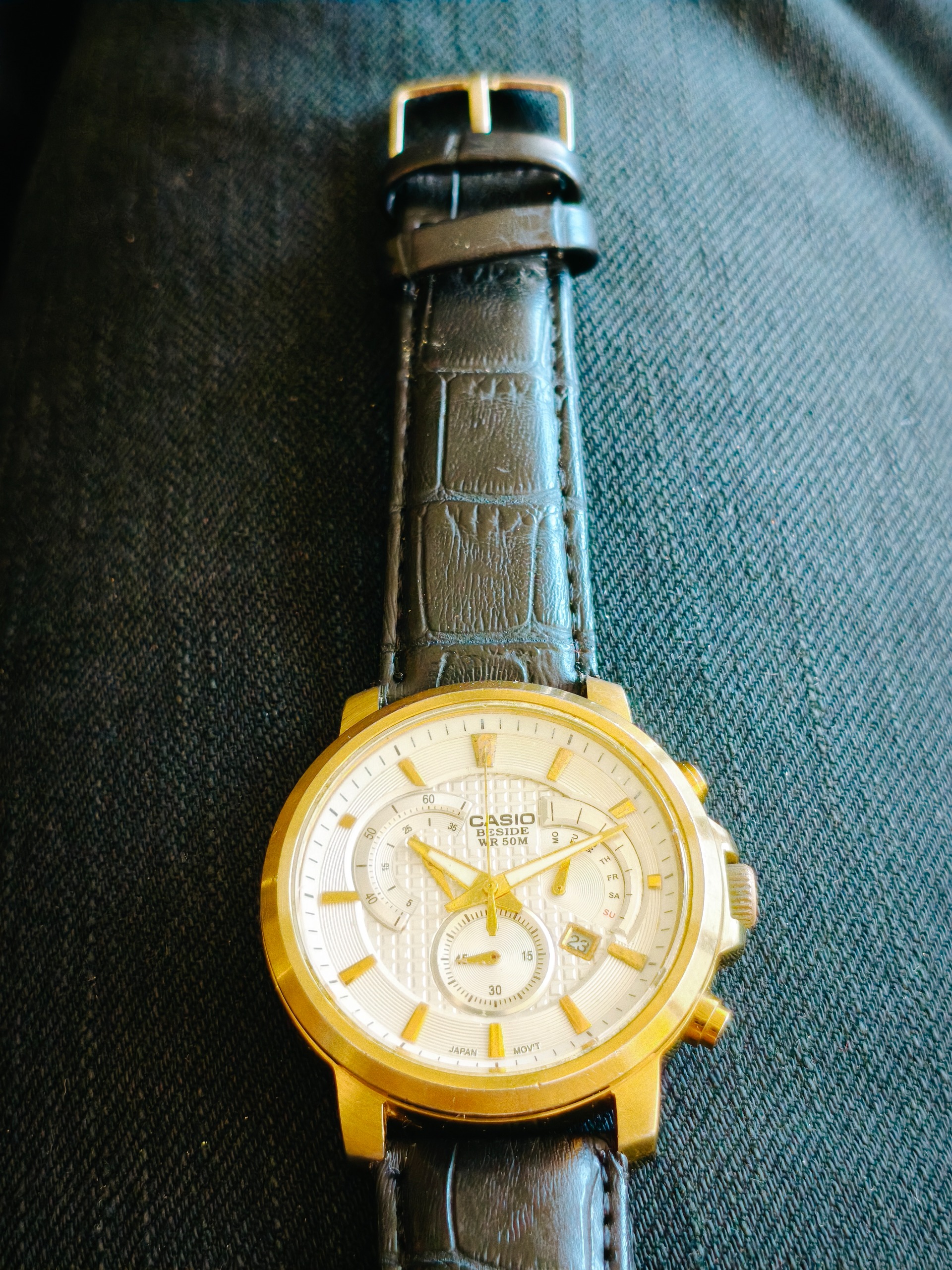 ساعت مچی مردانه **Casio Beside** یکی از مدلهای کلاسیک و اصیل برند نامدار کاسیو است که ترکیبی از طراحی لوکس و دوام فنی را در خود دارد. این مدل با قاب **طلاییرنگ** ساخته شده که به مرور زمان کمی کهنه و مات شده، اما همین حالت، به آن جلوهای خاص و **وینتیج و اصیل** داده است. صفحه ساعت از **جنس صدف طبیعی** طراحی شده و بازتابی ملایم و درخشان دارد که بسته به زاویه نور تغییر رنگ میدهد؛ ویژگیای که در ساعتهای لوکس بسیار کمیاب است.