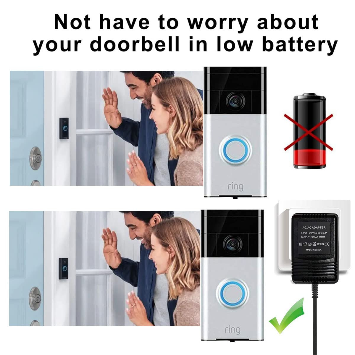 - یک راه حل سریع برای مشکل کم بودن باتری، به سادگی کابل 5 متر را در امتداد دیوار از پریز خود تا زنگ در با خروجی AC 18 ولت / 800 میلی آمپر اجرا کنید. شما به جای شارژ کردن باتری، زنگ ویدیوی خود را مستقیماً به منبع تغذیه وصل خواهید کرد.