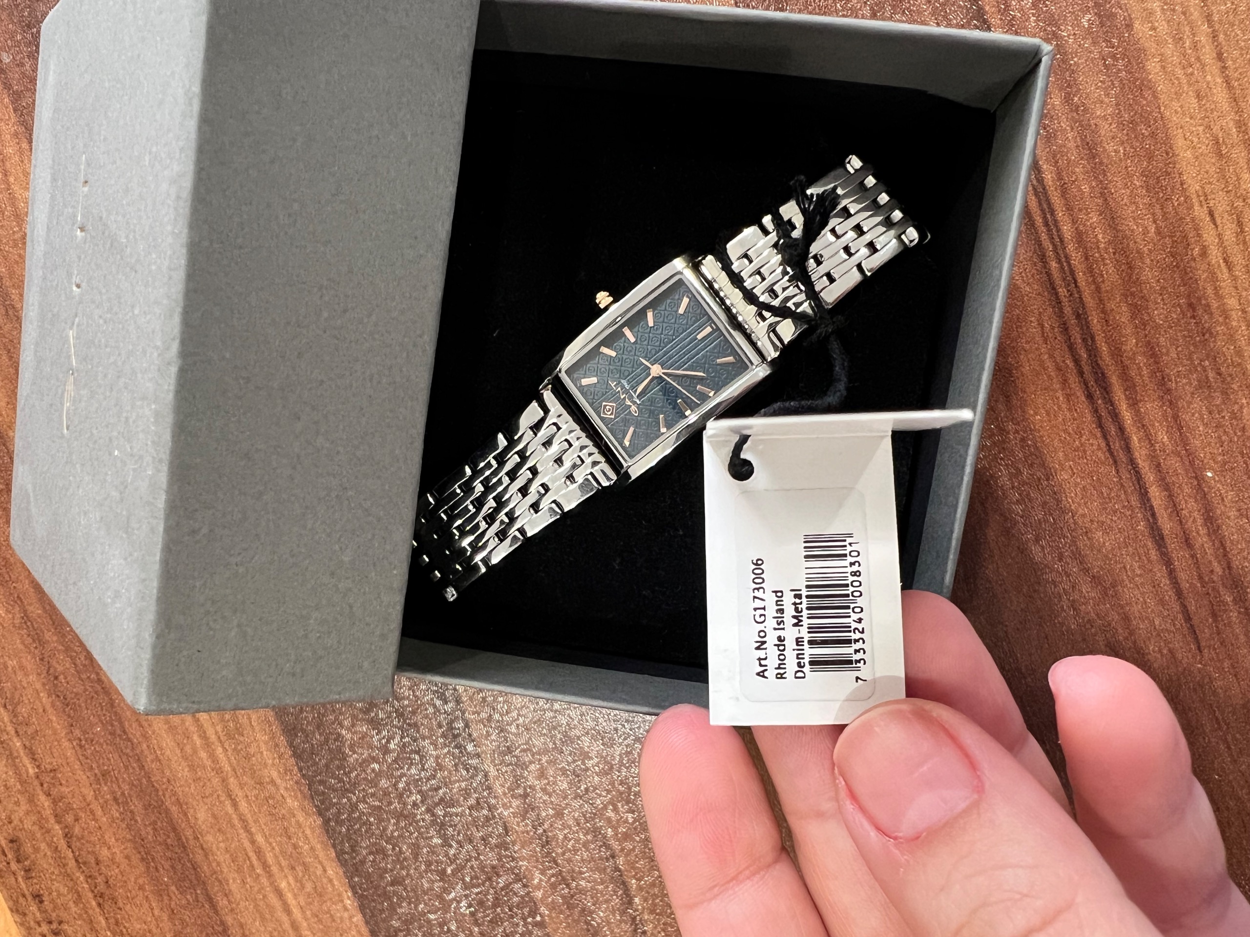 ساعت مچی استیل بسیار شیک و مدرن با طراحی مستطیلی، مناسب استفاده روزانه و مجلسی. دارای جعبه اورجینال و تگ اورجینال و بند مقاوم استیل ضدزنگ. مناسب برای هدیه دادن یا استفاده شخصی. ظاهر لوکس و کیفیت عالی. آماده تحویل فوری. ساعت هدیه بوده، اورجیناله و از آلمان خریداری شده. قابلیت کوچیک و بزرگ شدن داره. شماره رفرنس ساعت روی تگ متصل به ساعت هستش.