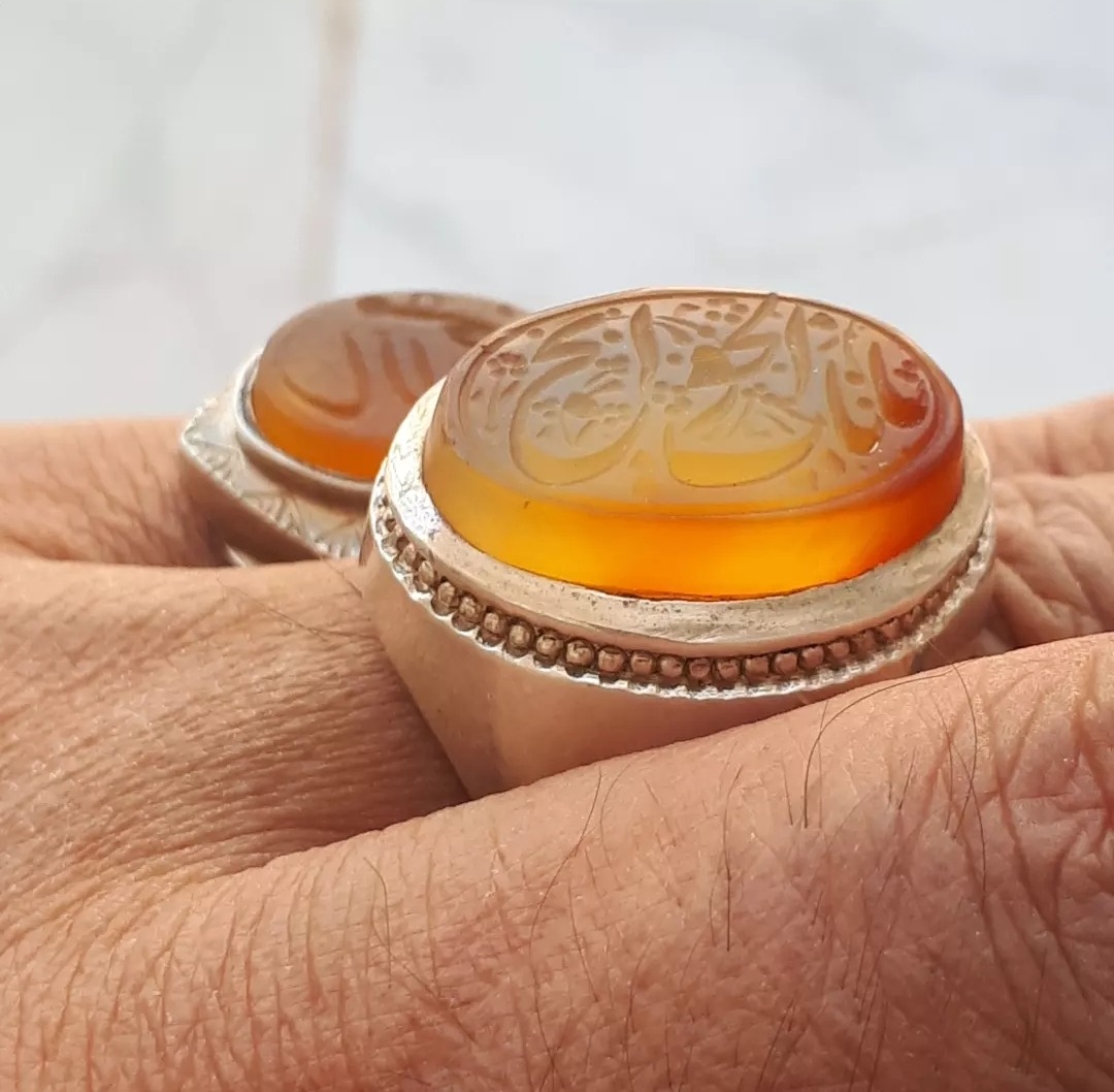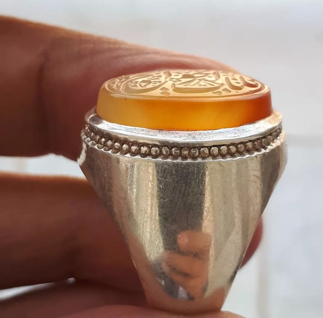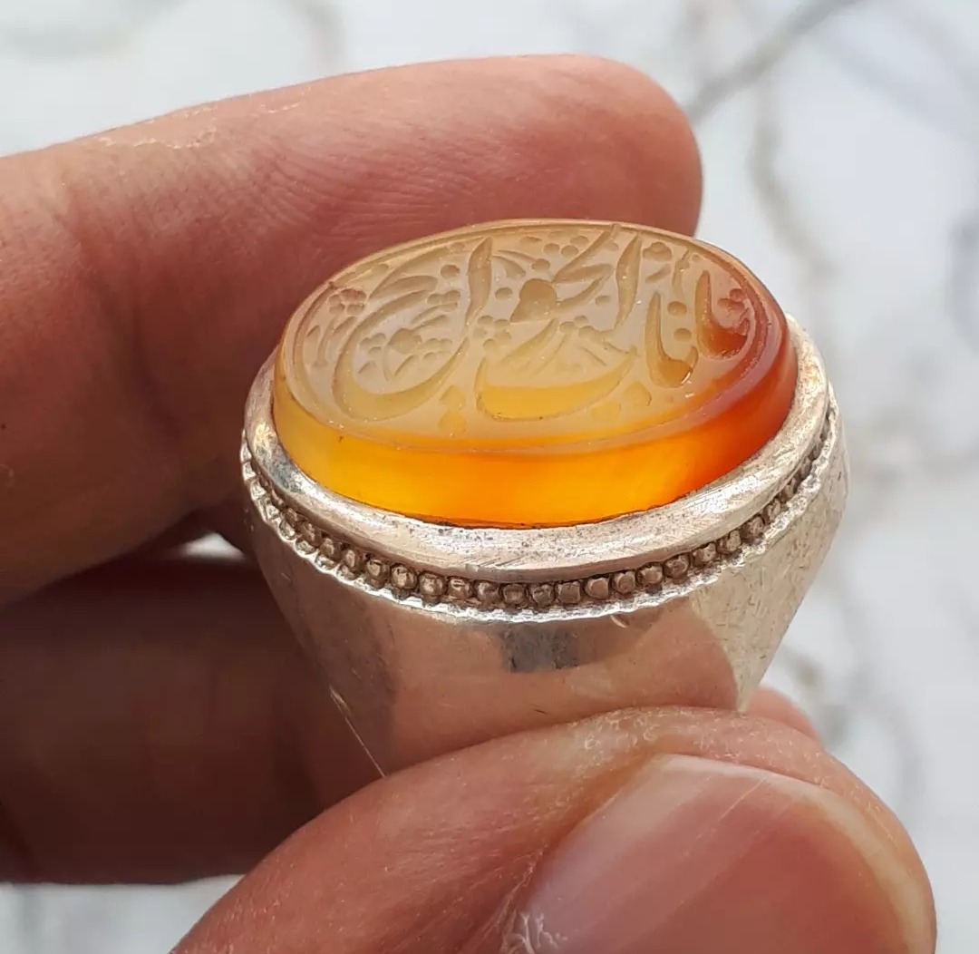 انگشترعقیق یمن چندرنگ با خط گودباذکریا باب الوائج رکاب دستساز استادایلیا بامهررکاب فیلی وپنبه ای رسه های منظم وزن 26 گرم سایز63 ذات داروکهنسال زیباوارزشمندوکلکسیونی