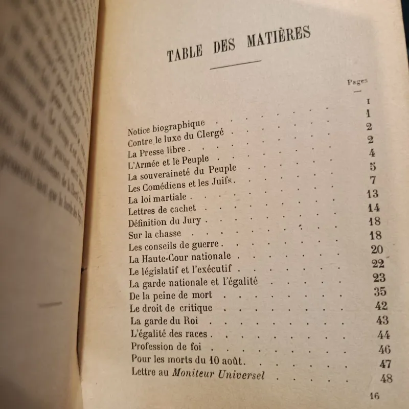 این کتاب مجموعهای از نوشتهها و سخنرانیهای ماکسیمیلیان روبسپیر، از شخصیتهای محوری انقلاب فرانسه است. عناوین فصول نشان میدهد موضوعاتی چون آزادی مطبوعات، حقوق یهودیان، مجازات اعدام، آموزش عمومی و آزادی ادیان در کتاب مورد بحث قرار گرفتهاند.