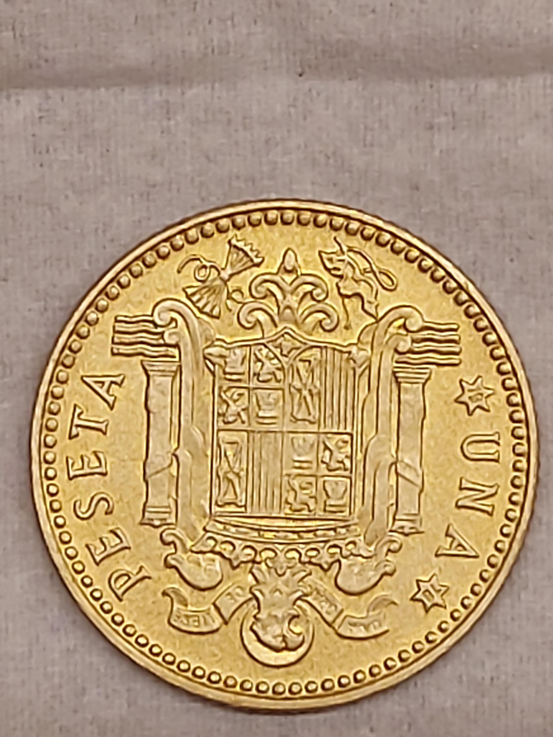 آلیاژ برنز - سال ضرب 1975 که در پشت سکه هم در دو ستاره نوشته شده - تصویر خوان کارلوس اول پادشاه اسپانیا - در اثر مرور زمان رنگ آن طلایی شده