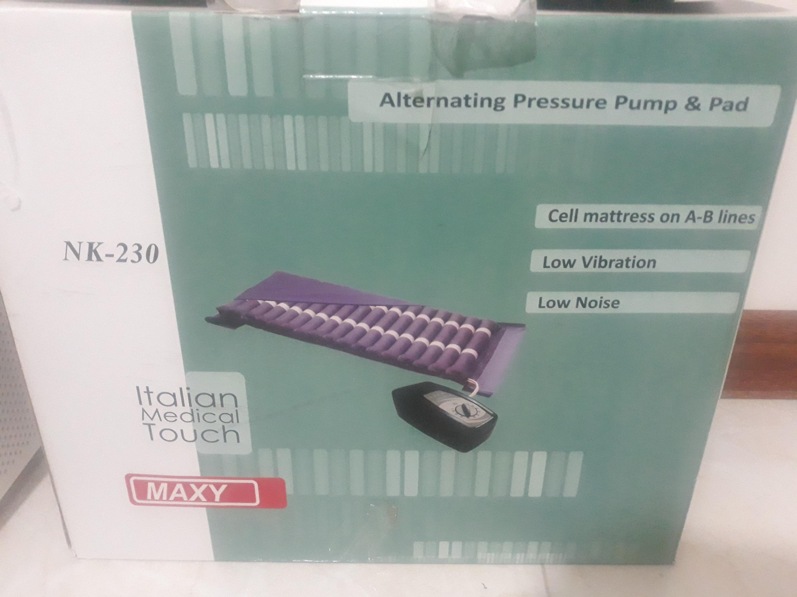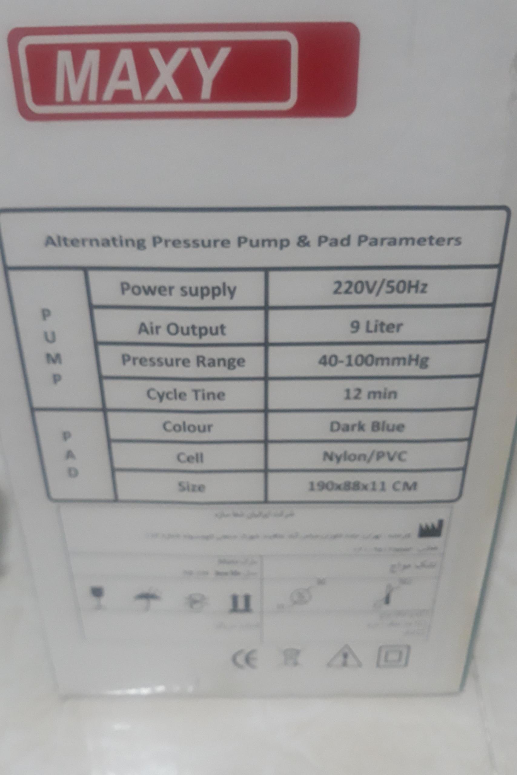 تشک مواج سلولی ضد زخم بستر مکسی MAXY NK-230 ویژگی ها: تشک مواج سلولی مکسی مدل NK-230 مناسب برای بیمارانی است که توان حرکتی ندارند و پوست آنها به دلیل خوابیدن طولانی روی تخت حساس شده و دچار زخم بستر شده اند.جنس این تشک از پلی اورتان می باشد و ضد حساسیت است.این تشک برای بیمارانی مناسب است که وزنشان بالاست و برای طولانی مدت روی تخت می خوابند و حرکت زیادی ندارند.   ویژگی های تشک مواج سلولی مکسی مدل NK-230: مناسب برای جلوگیری از بروز زخم بستر و درمان رخم بستر اولیه با ریسک پایین ابعاد تشک : 200*90*8 سانتی متر پمپ کم صدا قدرت پمپ 9 لیتر در دقیقه پرشدن تشک در کمتر از 15 دقیقه ساخته شده از مواد اولیه با کیفیت ضد آلرژی دارای یک سال گارانتی پمپ دارای سوراخ های لیزری ریز برای جلوگیری از تعریق متریال : نایلون و پی وی سی ضد آلرژی جنس روکش : نایلون قابل شستوشو و ضد عفونی و ضد حساسیت دارای سوراخ های تنظیم هوا توان خروجی قوی با بهترین کیفیت و مقاومت در برابر وزن های بالا قابل استفاده در بیمارستان ها و منزل