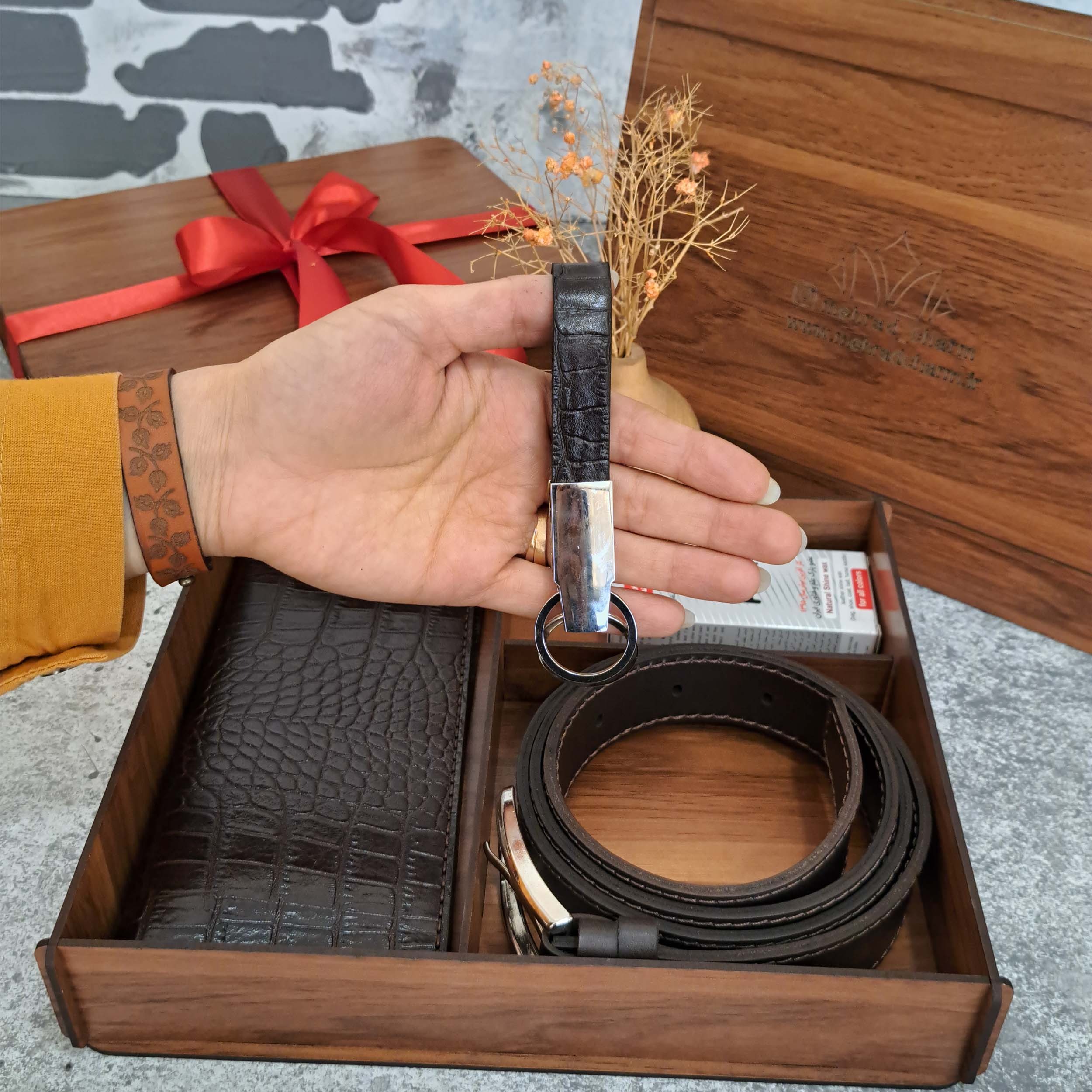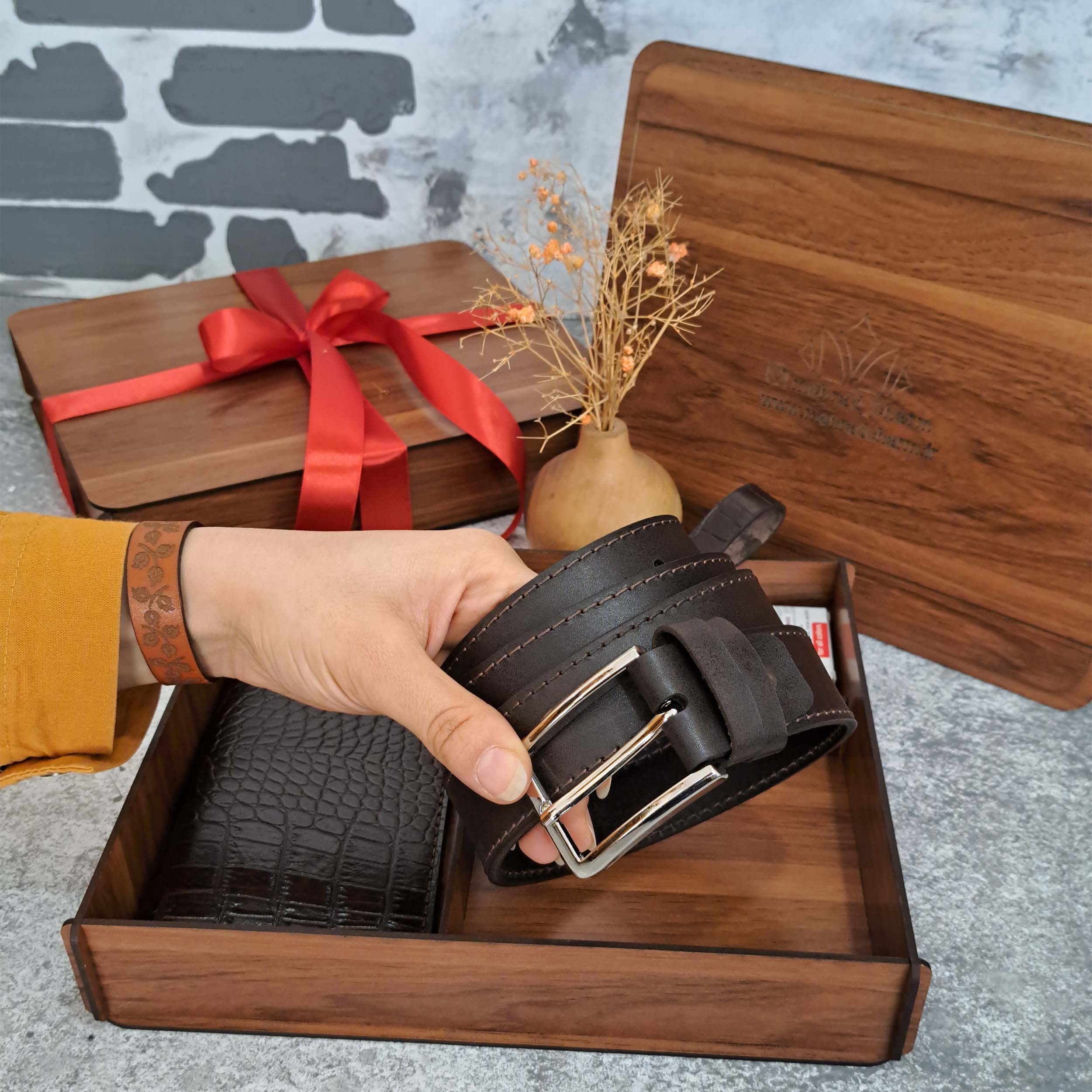 ست هدیه چرم طبیعی کیف پول و کمربند و جاکلیدی