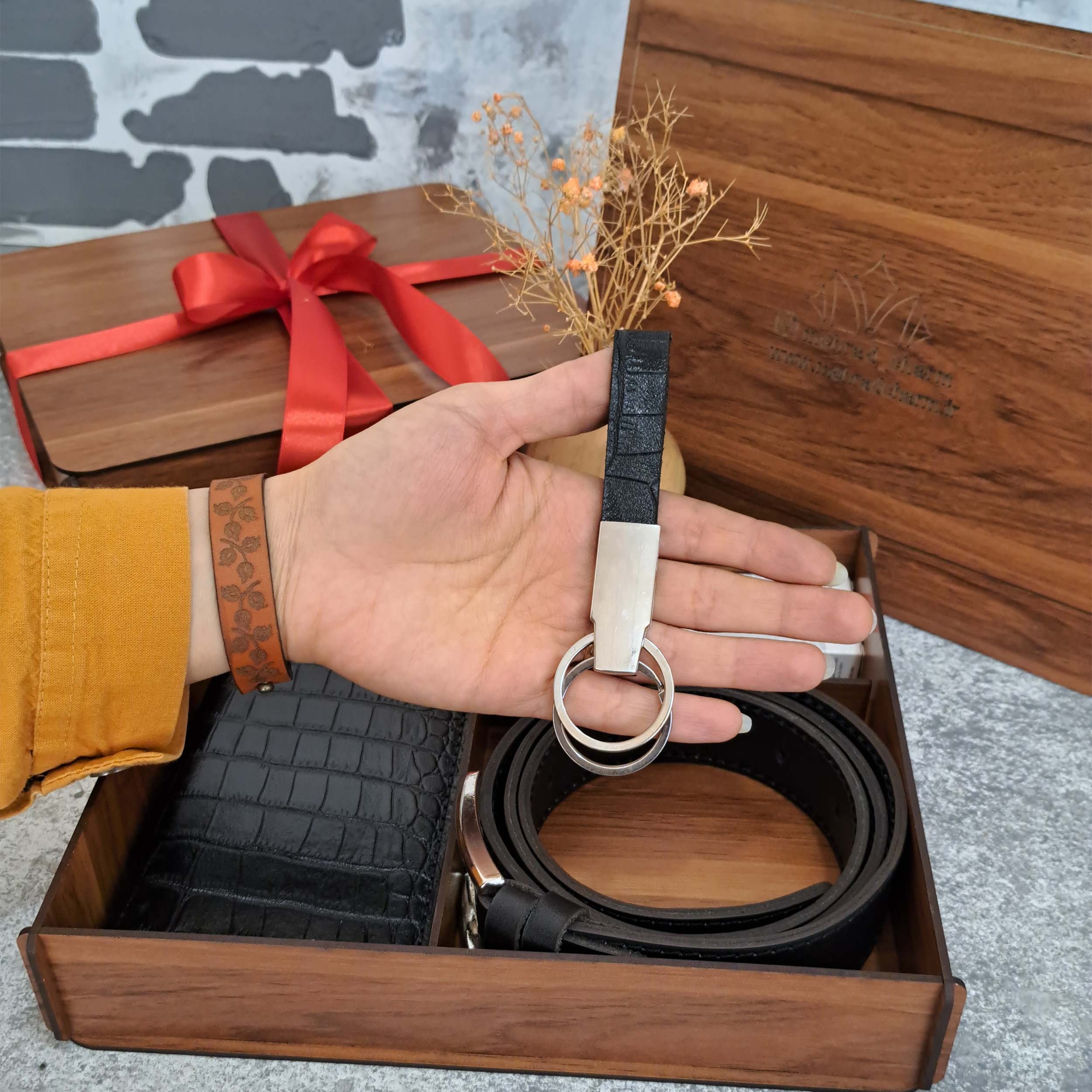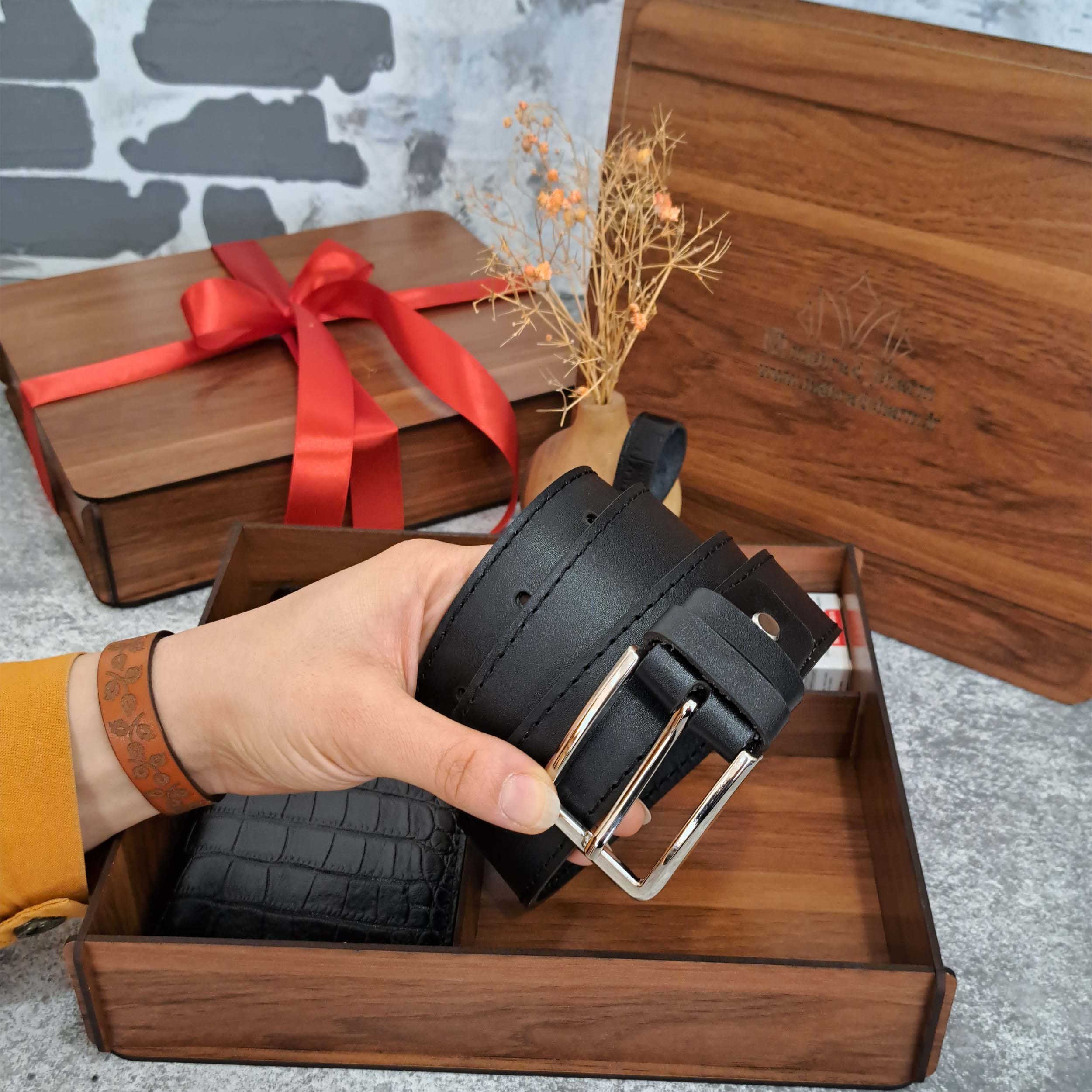 ست هدیه چرم طبیعی کیف پول و کمربند و جاکلیدی