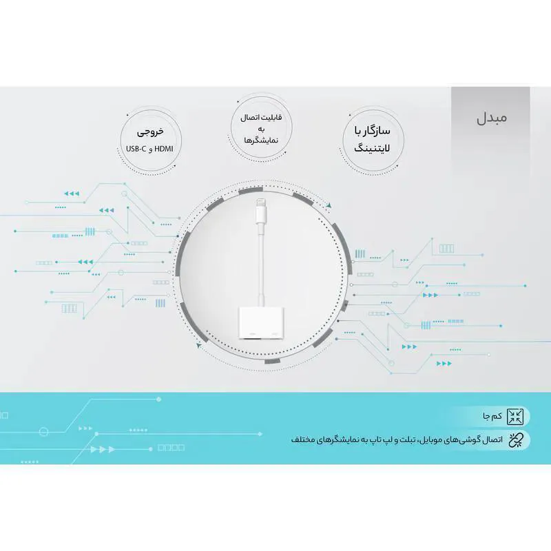- مناسب برای: iPhone 5/5S/5C iPhone 6/6 Plus iPad 4th Generation and above و مدل های بالاتر از آیفون 5 و امکان تماشای برنامه ها و ویدئوهای آیفون و آیپد در مانیتور یا ویدیو پروژکتور