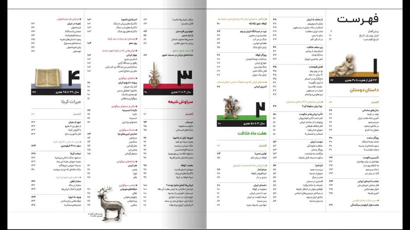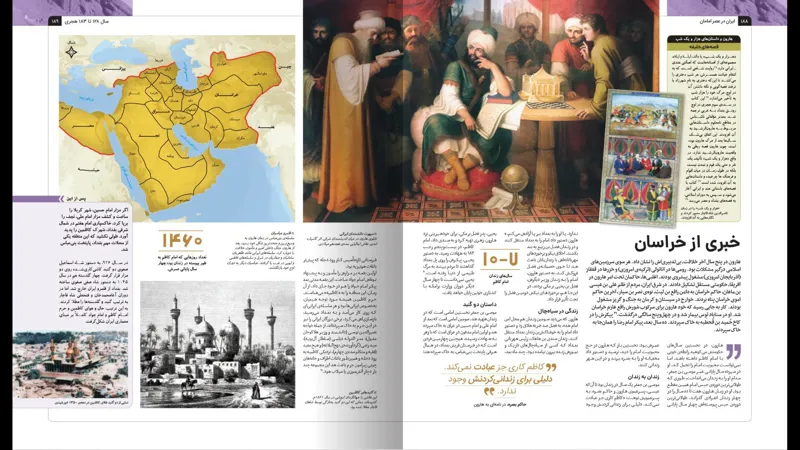 «ایران در عصر امامان» مقطعی را روایت میکند که ایران از دورهی باستان به دورهی اسلامی گذر میکند و رویدادهای سیصدوپنجاه سالِ نخست دورهی اسلامی را در برمیگیرد این مقطع، دورهی مهمی در تاریخ ایران و عربها است با ظهور اسلام در شبهجزیرهی عربستان، عربها به واسطهی قرآن و کتابت وارد تاریخ شدند همچنین، با سقوط قدیمیان، ایران از دوران باستان گذر کرد و گام به دورهی اسلامی گذاشت مردم ایران بعد از الحاق به قلمرو اسلامی، استقلال زبانی و فرهنگیشان را حفظ کردند و مانند دیگر سرزمینها، از جمله مصر، در زبان و فرهنگ رسمی عربها حل نشدند آنها افزون بر انتقال دانش و راهاندازی نهضت ترجمهی علوم از فارسی و یونانی به عربی، در انتقال خلافت از امویان به عباسیان و ایرانیسازی آن نقش چشمگیری داشتند در ابتدای سدهی سوم هجری، ایرانیها نخستین مردمانی لقب گرفتند که عَلَم خودمختاری و استقلال از خلافت را برافراشتند تاریخنگاران دربارهی این دوره، نظرات مختلفی دارند برخی آن را سالهای سرخوردگی و سکوت ایرانیان میدانند و برخی دیگر، سالهای پرهیاهوی جنبشهای فکری، عقیدتی و خیزشهای گوناگون (دوازده پوستر از تصاویر منتخب کتاب که مخصوص خریداران منتخب بوده در بسته لحاظ شده که در بسته اصلی به صورت معمول وجود ندارند)