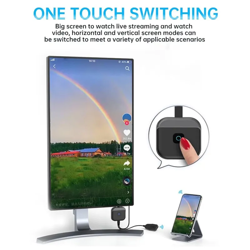 سوئیچینگ با یک لمس: این آداپتور نمایش آینهای صفحه تلویزیون از تماشای ویدیوها روی صفحه بزرگ پشتیبانی میکند و با یک لمس بین حالتهای صفحه افقی و عمودی جابجا میشود تا سناریوهای مختلف برنامه را برآورده کند.