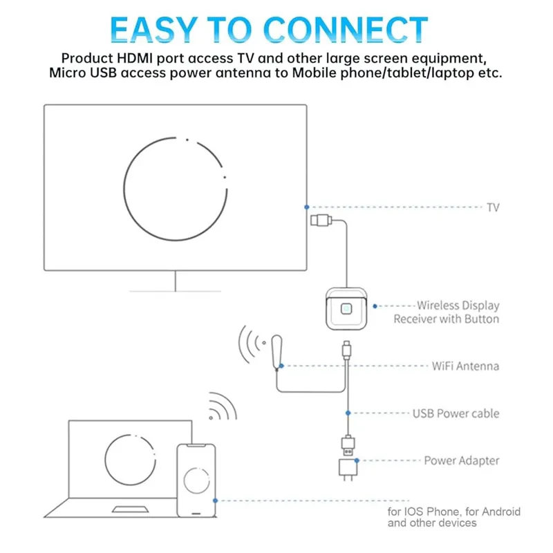 اتصال آسان: برای اتصال این آداپتور تلویزیون بیسیم، نیازی به برنامه نیست. پورت HDMI محصول به تلویزیون و سایر تجهیزات صفحه بزرگ دسترسی دارد، میکرو USB به آنتن برق به تلفن همراه/تبلت/لپتاپ و غیره دسترسی دارد. میتوان به صورت بیسیم به محصول متصل شد تا به اشتراکگذاری/پخش آسان صفحه نمایش آسان شود. پشتیبانی از چندین صفحه نمایش بیسیم: این آداپتور نمایشگر بیسیم 4K HD از چندین پروتکل صفحه نمایش بیسیم از جمله Miracast، DLNA، EZMira پشتیبانی میکند. برای اشتراکگذاری بیسیم PPT، ایمیلها، اسناد و سایر محتوا، اشتراکگذاری بیسیم محتوای آموزشی، اشتراکگذاری بیسیم عکسها، ویدیوها، فیلمها.