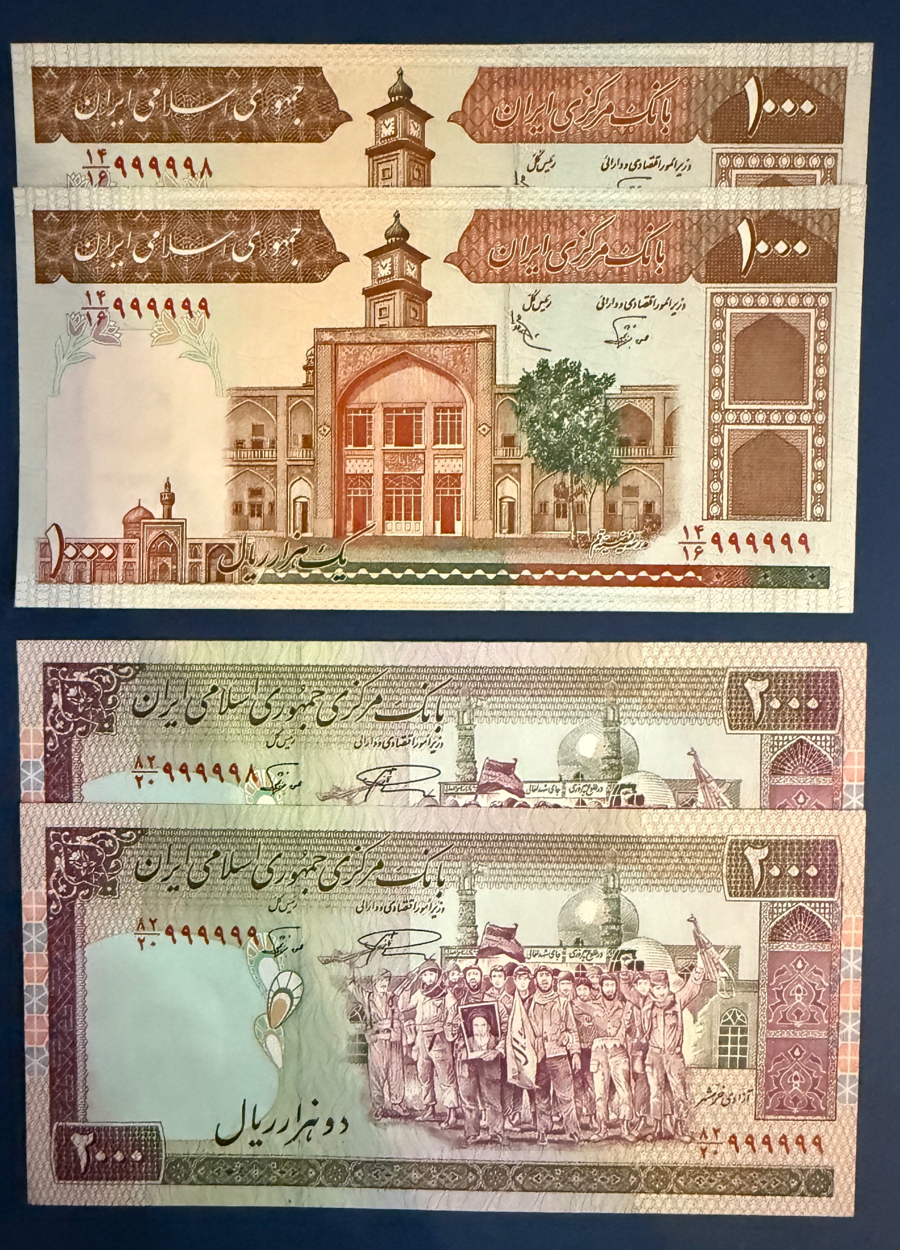دو جفت همسان صد تومنی فیضیه و دویست تومنی تظاهراتی بسیار بسیار خاص و کمیاب با شماره های عالی و دلربای رند 999 999