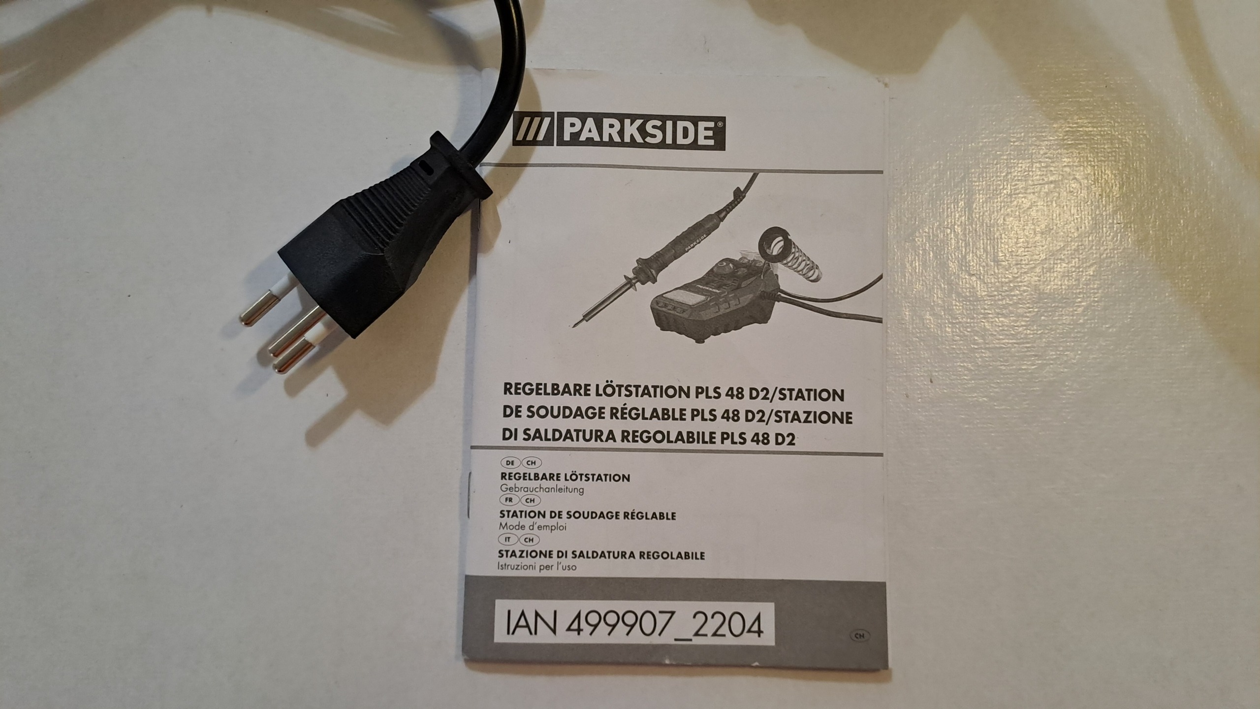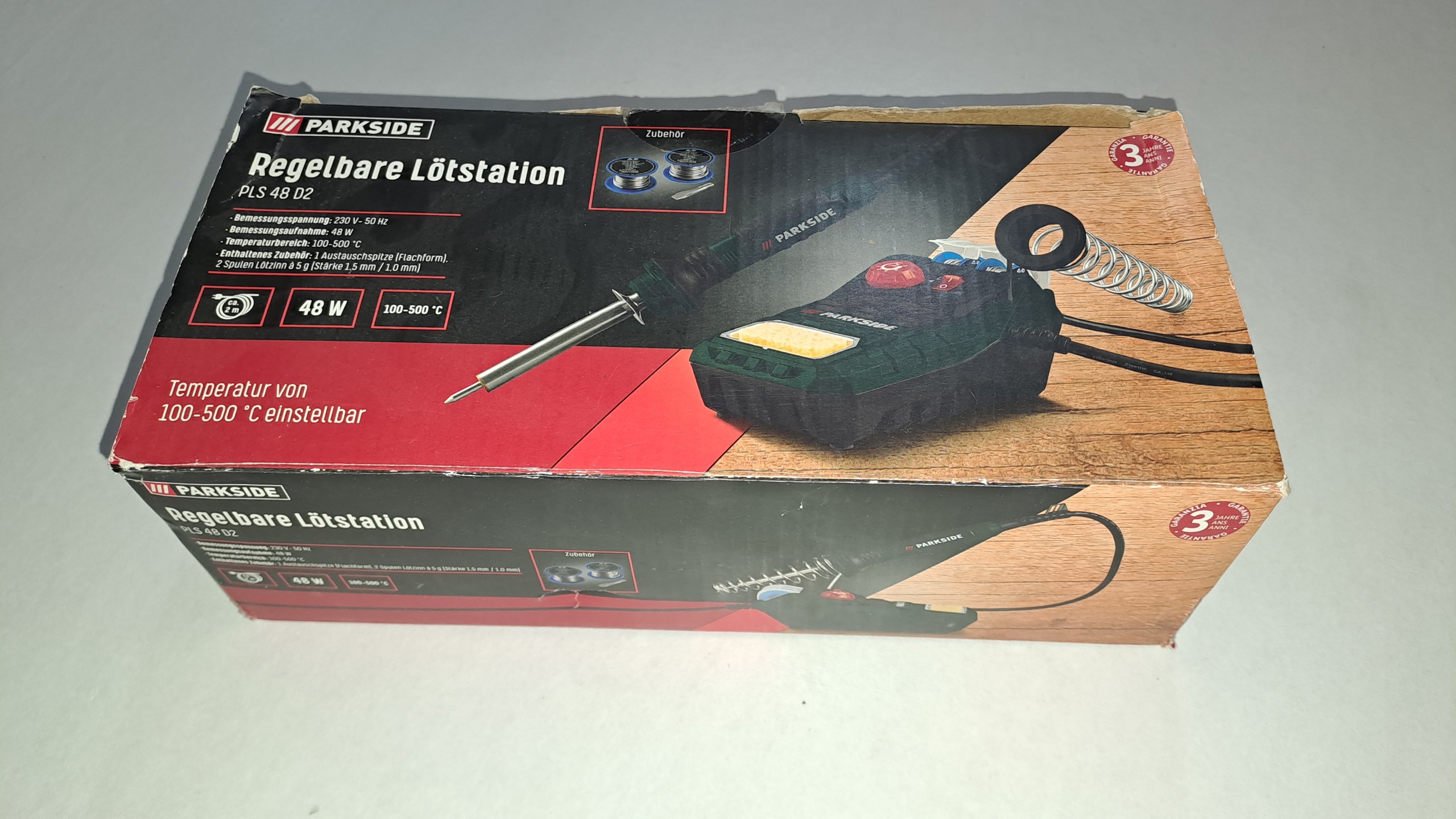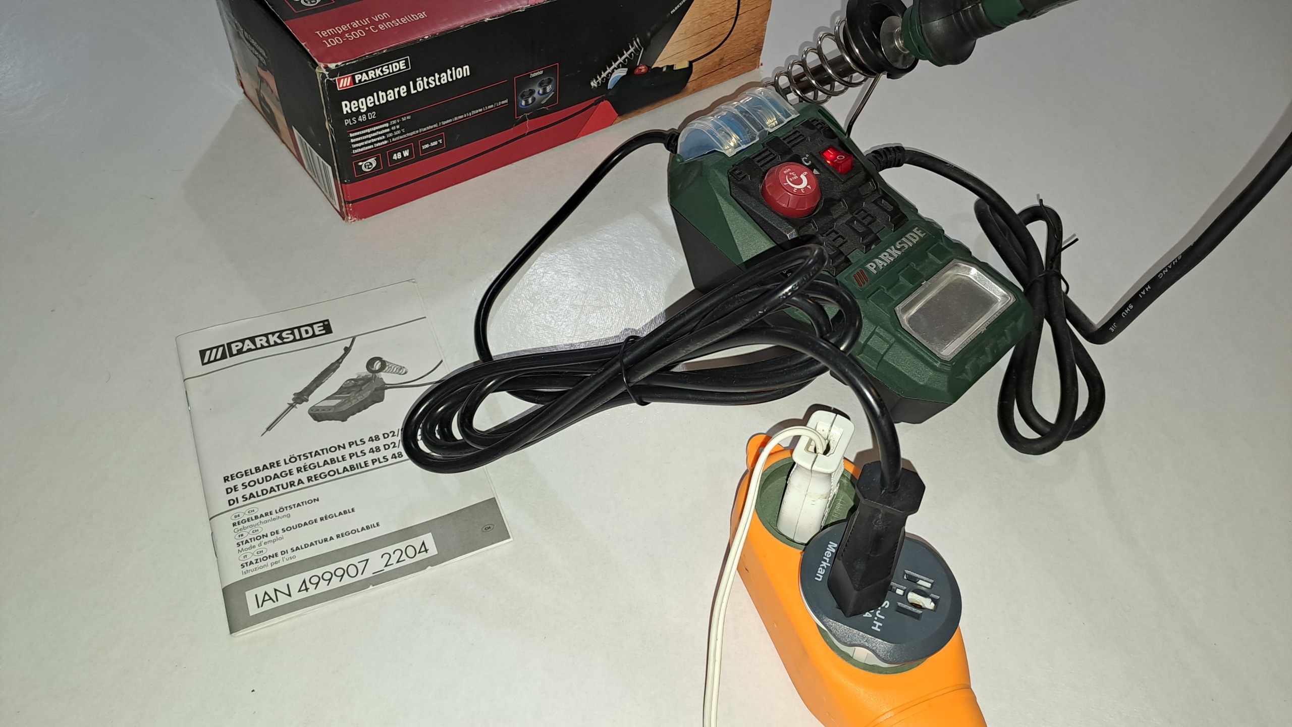 هویه اصل آلمانی برند parkside با قابلیت تنظیم دما از 100 تا 500 درجه، 48 وات به همراه دو قرقره قلع و سر تخت که رو دستگاه بوده.