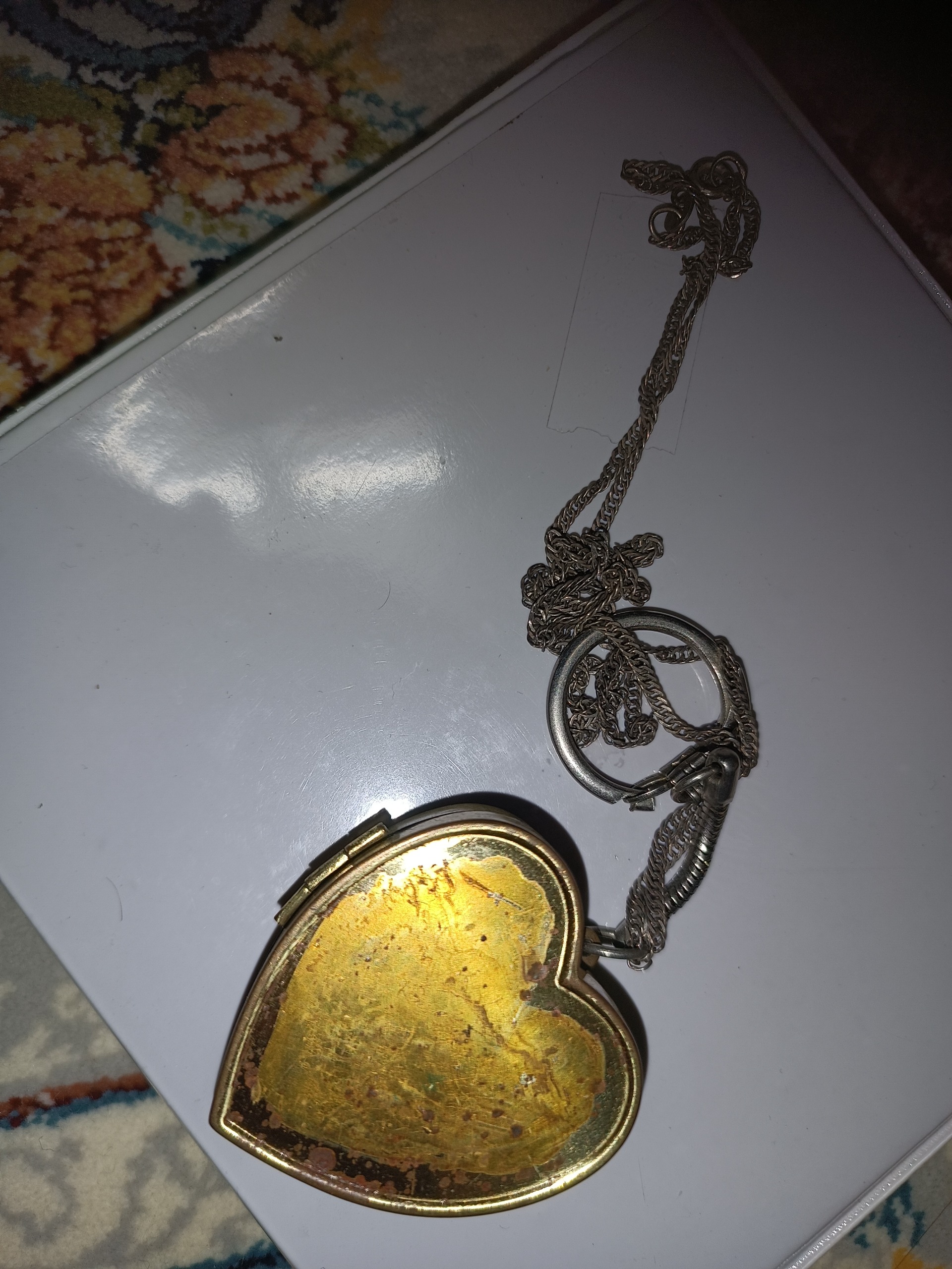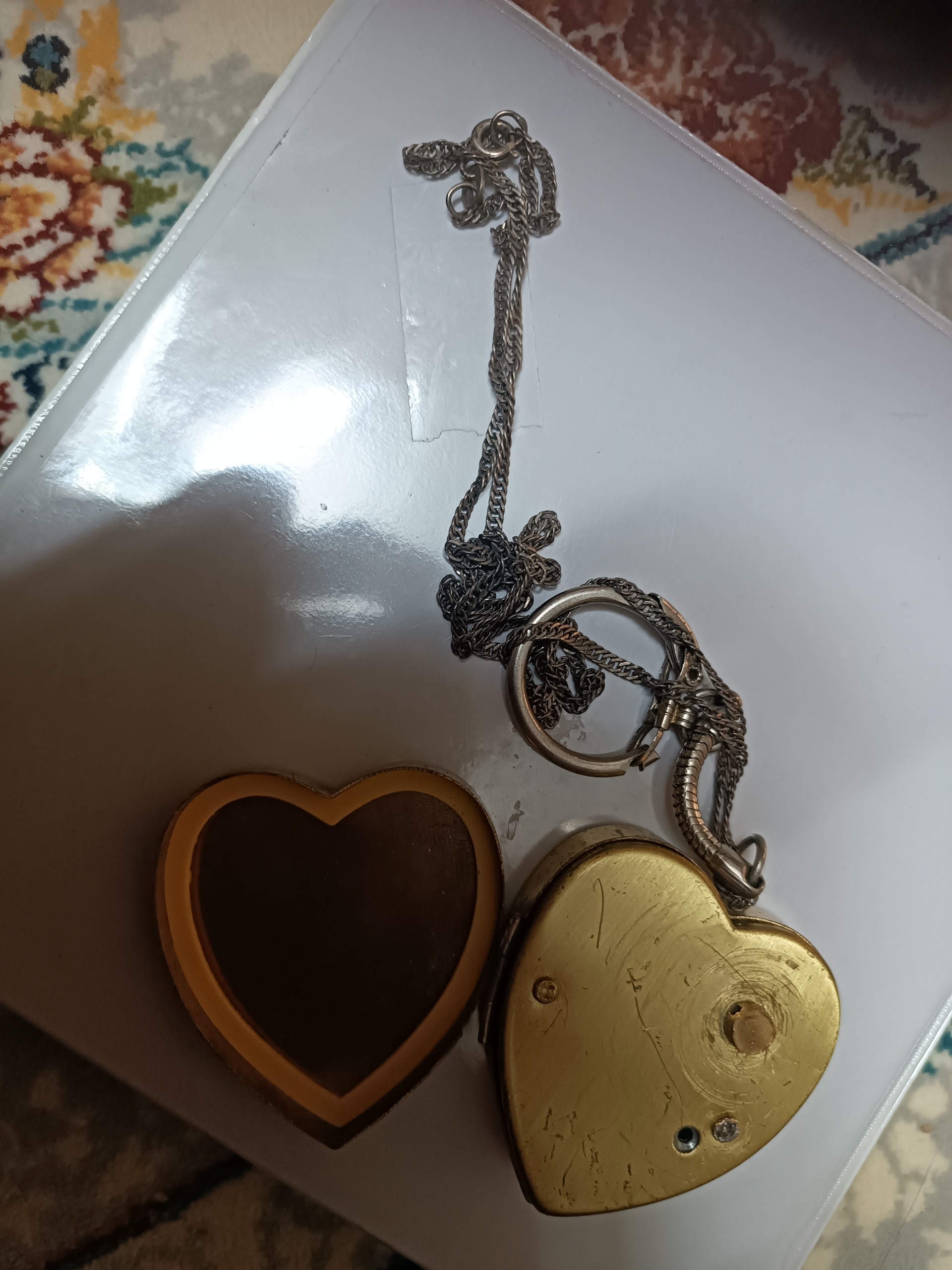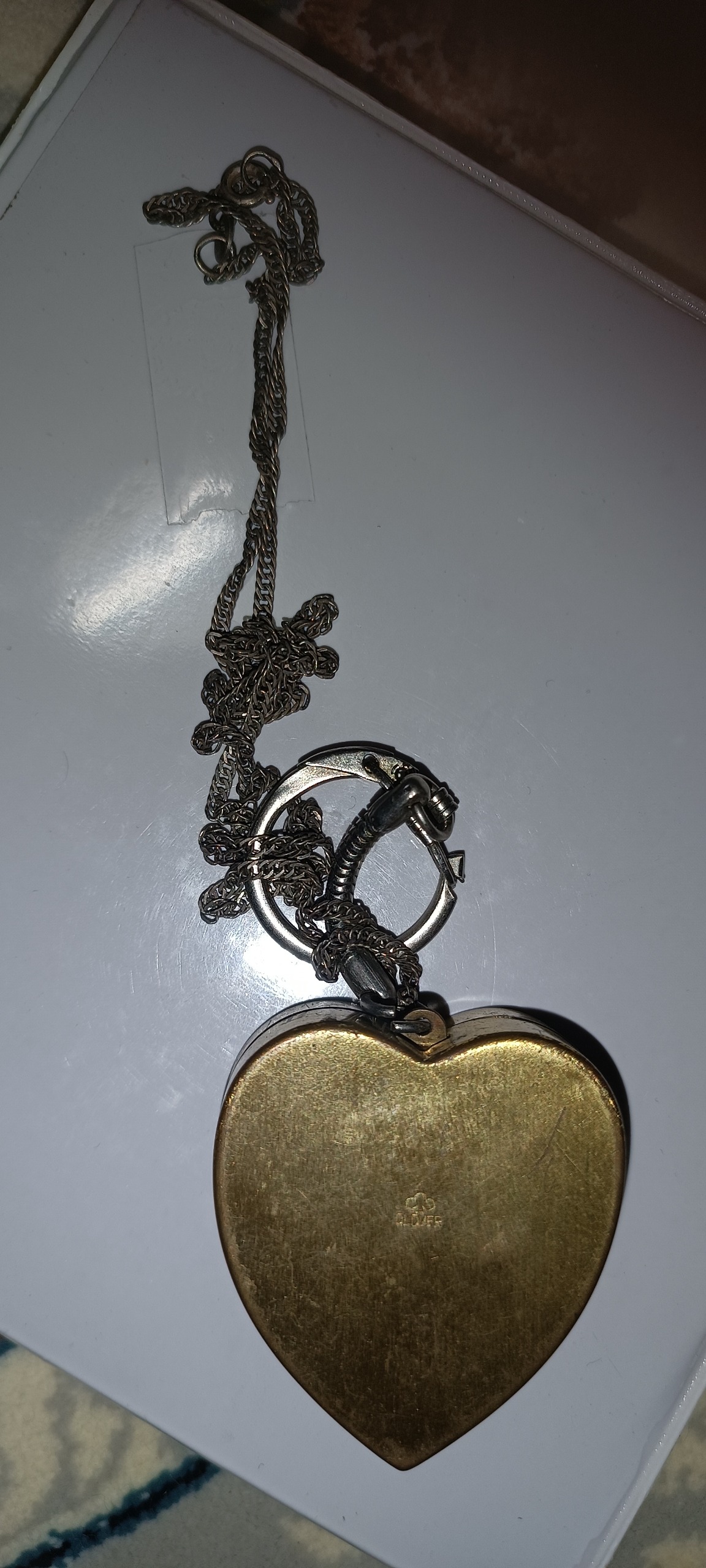 گردنبند قلبی برنجی با زنجیر نقره خاص ...معیوب نوشتم چون گردنبند قلبی موزیکال بوده و کوک اش خراب شده باید سرویس شود و اینکه خش های داره که مشخصه در تصویر....