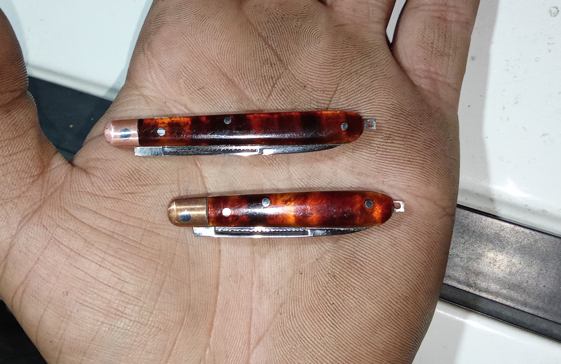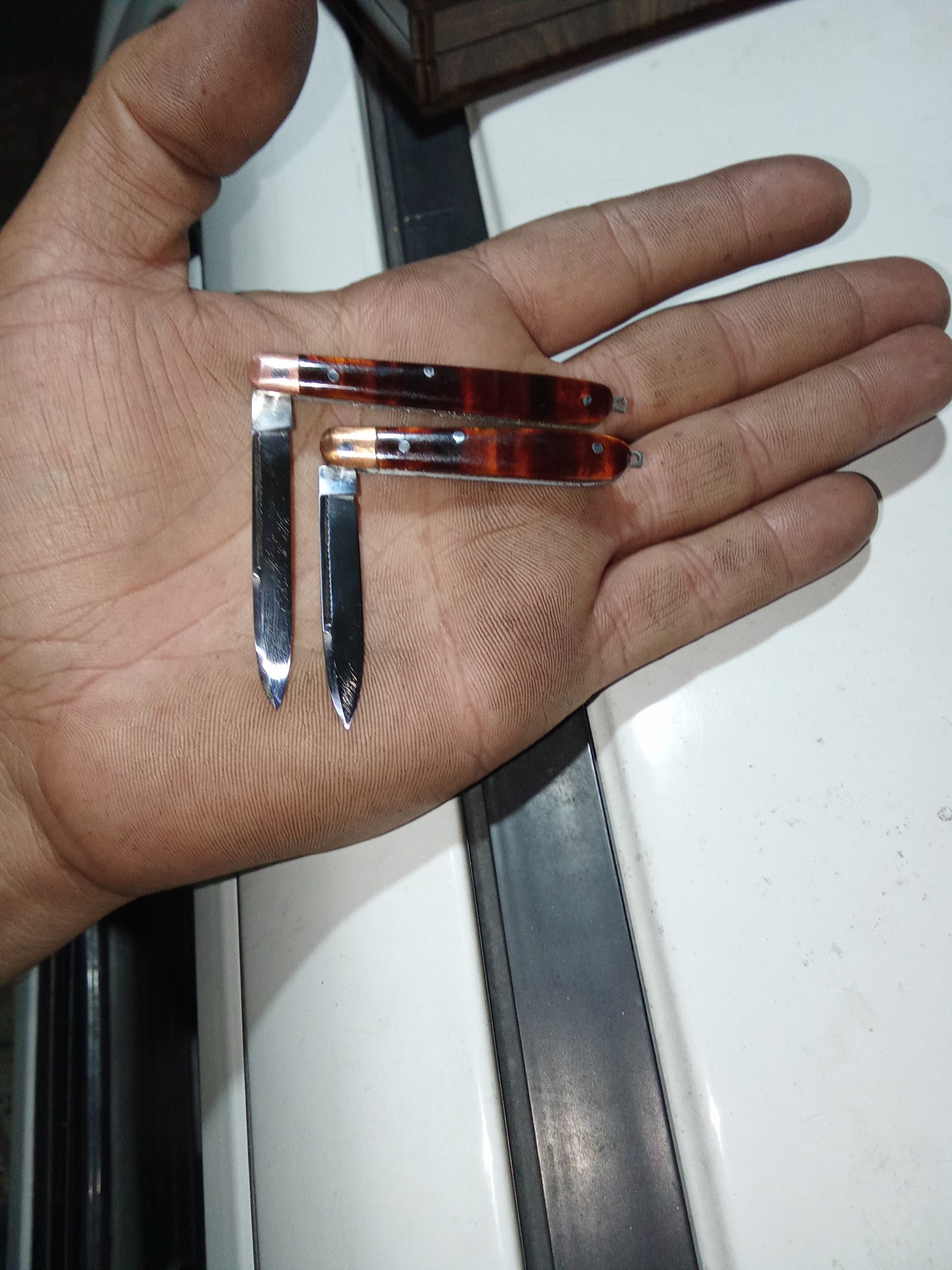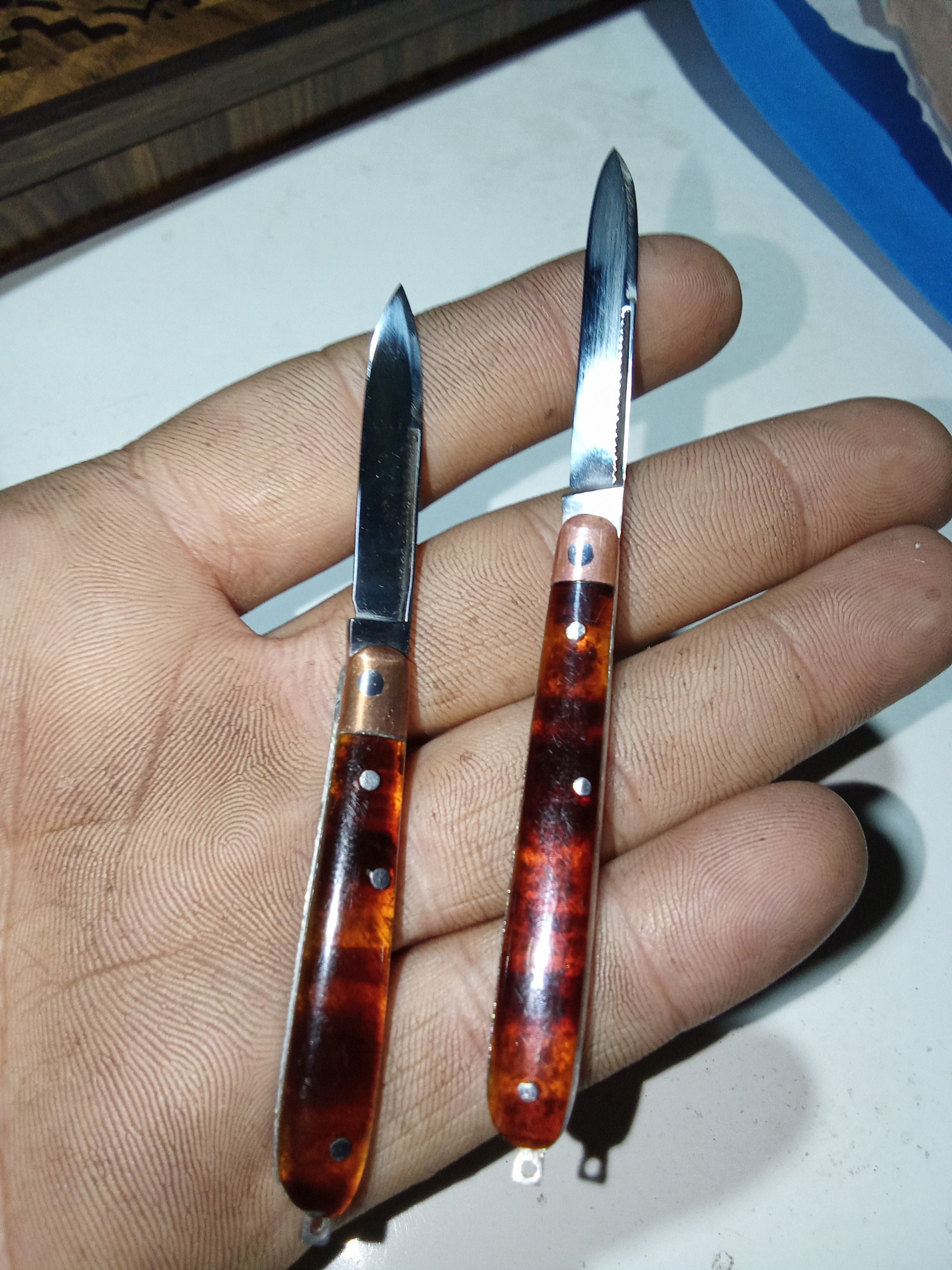چاقو تاشو مینیاتوری کوچکترین سایز ببادسته فیبراتشین قدیمی وصدف آلمانی تیغه فولاد فنرقوی بدون درز ولقی کاراستاد پیشکسوت شهر زنجان با93سال سن هنوز باستان هنرمند مشغول بکار میباشد وسایز ها از8سانت تا 12سانت میباشد