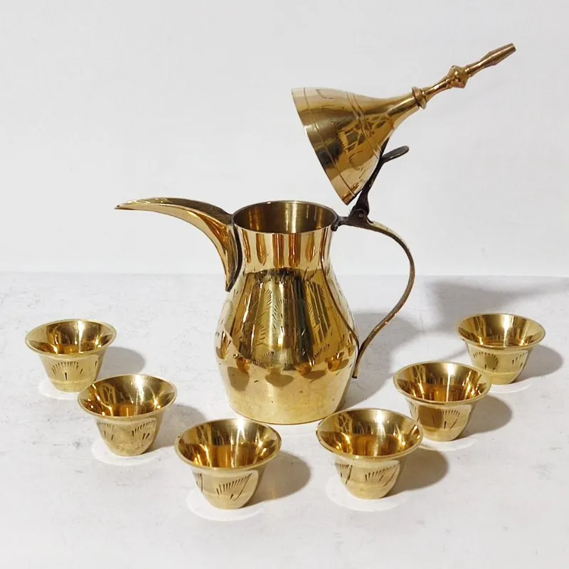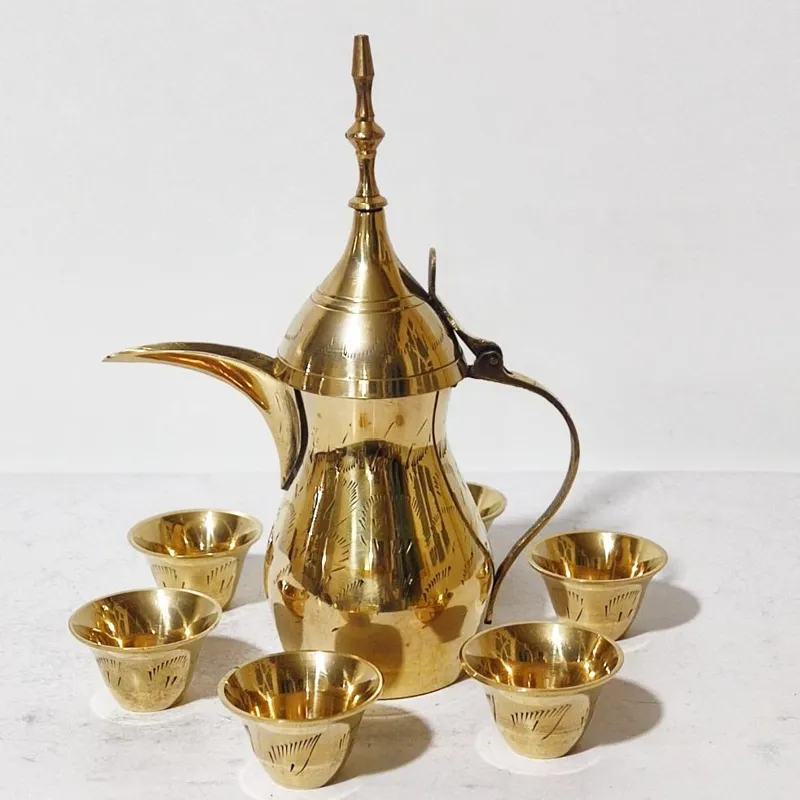 ست دله (قهوه جوش )با شش عدد شات قهوه خوری تمام برنجی ساخت هندوستان مدل قلم دست با طرح هفت قلو دست و سطح کیفیتی بی نظیر و درجه یک مناسب استفاده دائم و قابل شستشو بدون تغییر رنگ