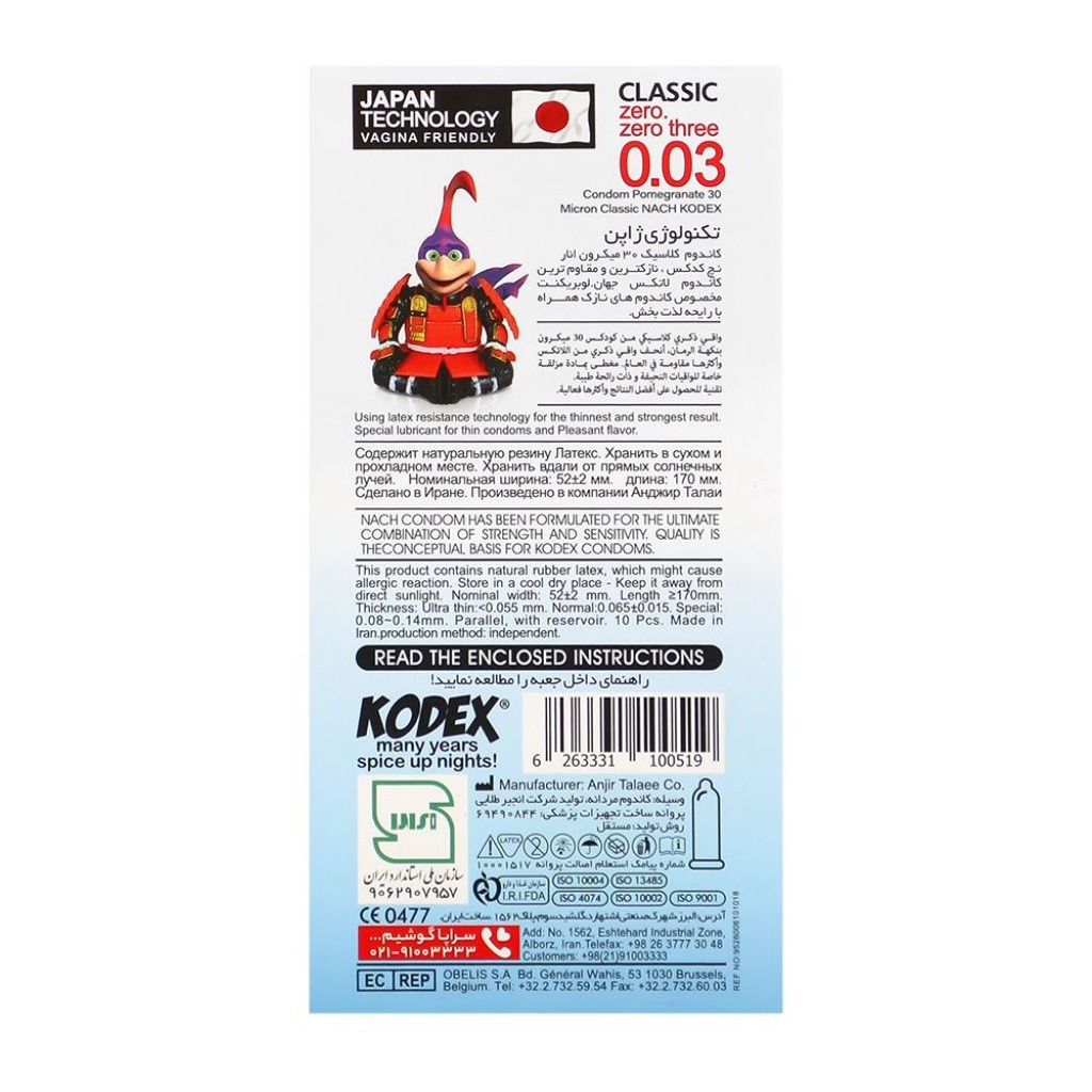 ویژگیهای کاندوم فوق العاده نازک کلاسیک 0.03 انار ناچ کدکس NACH KODEX Classic بسته 10 عددی