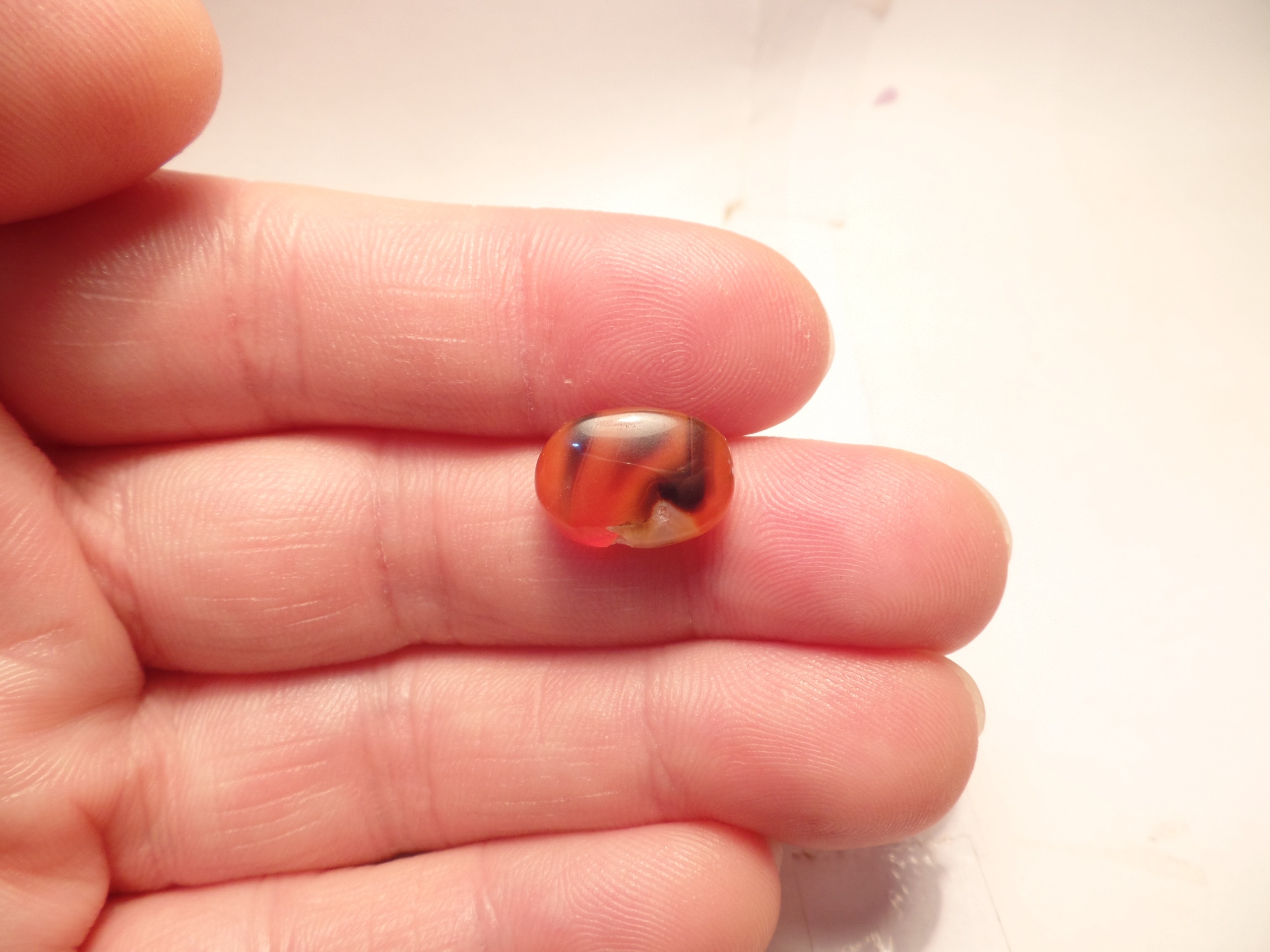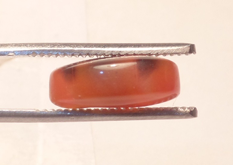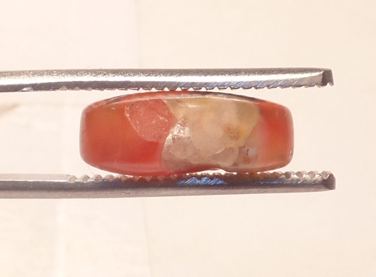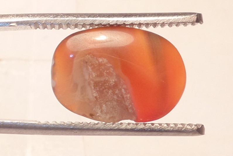 طرح : یک قطعه نگین عقیق چند رنگ ترکیبی نارنجی و مشکی و سفید خوش رنگ و خوش طبع با ژئود یخی در پشت و پهلوی سنگ و با تراش بیضی دیواره دار رو و زیر محدب. پهلوی سنگ با ابزار سمبه قدیمی یک حالتی شبیه به کندگی ایجاد کرده اند که نوعی نشان هست.