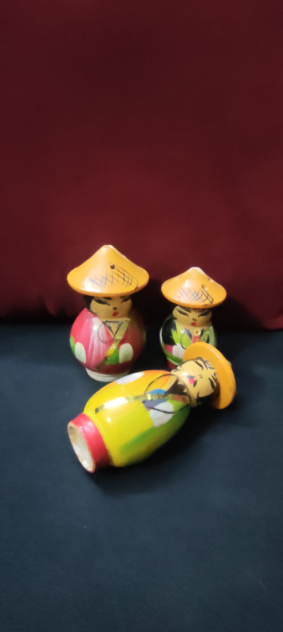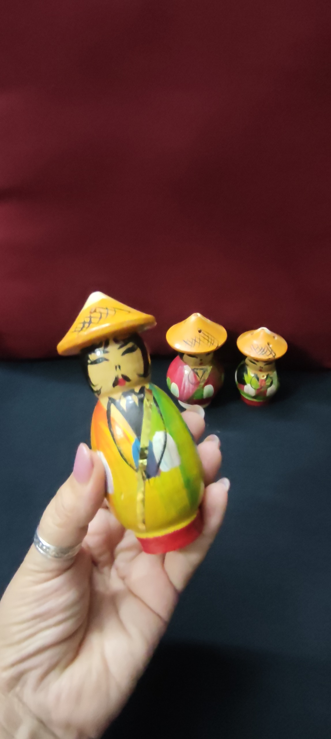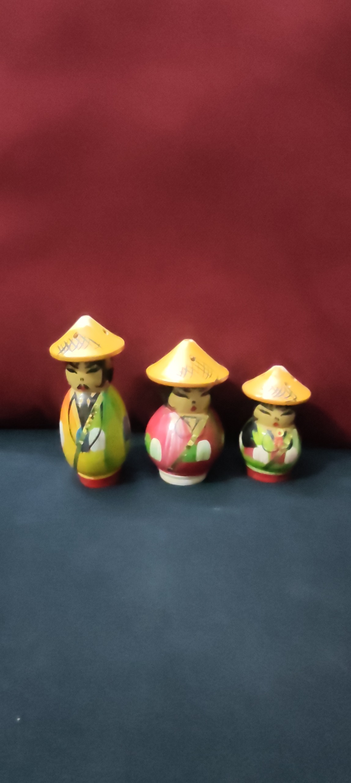 ست سه عددی نمکدان خانواده ژاپنی جنس چوبی ساخت روسیه و قدیمی سبیه عروسک متروشکا زیبا، إنتیک و کلکسیونی