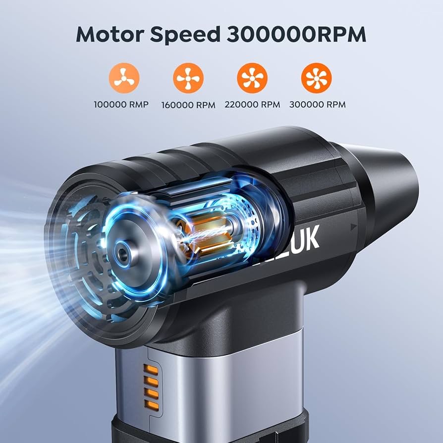 سرعت فوقالعاده بالا و قدرت قابل تنظیم: با دستگاه گردگیر برقی ما که دارای موتور قدرتمند 300000 دور در دقیقه است، عملکرد بینظیری در نظافت را تجربه کنید. تنظیمات قابل تنظیم 4 سرعته (کم/متوسط/زیاد/توربو) به شما این امکان را میدهد که جریان هوا را برای لوازم الکترونیکی ظریف، گرد و غبار سرسخت، کارهای نظافت سنگین یا باد کردن تشک بادی خود تنظیم کنید. ایدهآل برای کیبورد، کامپیوتر، لپتاپ، فضای داخلی خودرو و موارد دیگر!