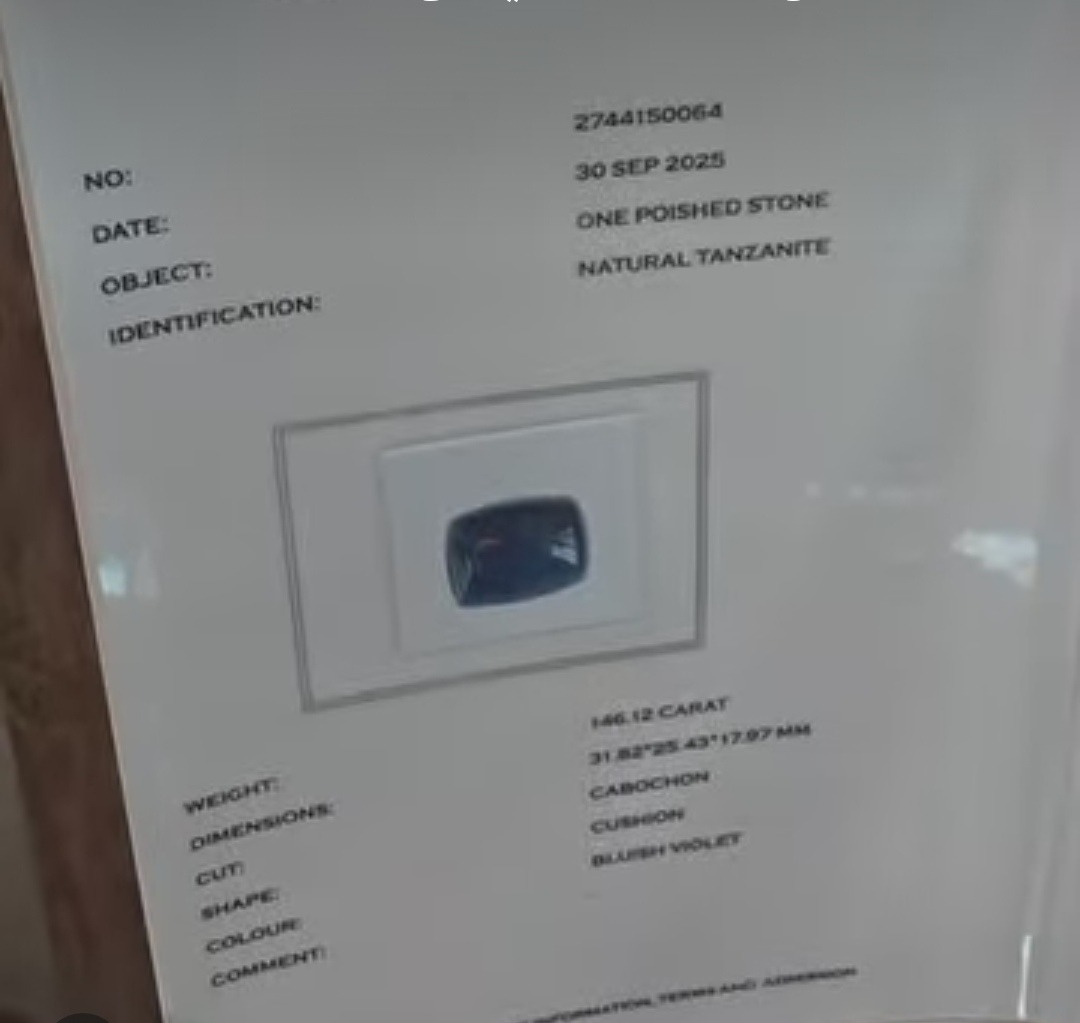 گوهر ناب و کمیاب تانزانایت اصیل طبیعی معدنی بسیار خوشرنگ و درخشان به وزن استثناییه 146/12 قیراط دارای شناسنامه و سرتیفیکت معتبر جهانی