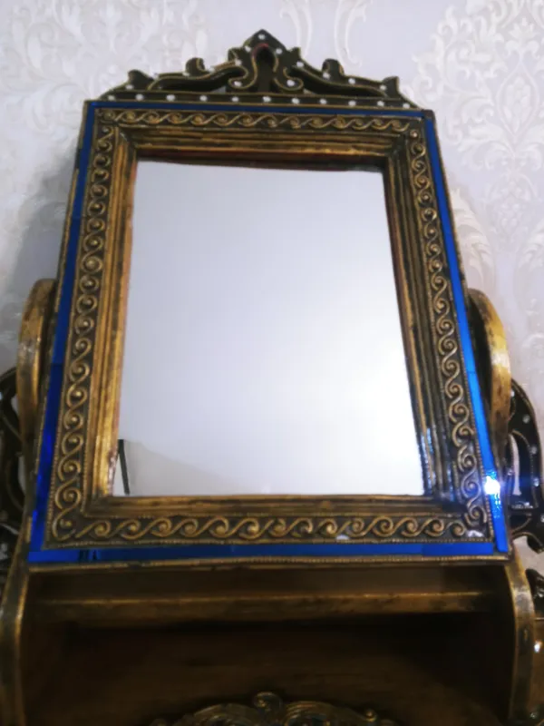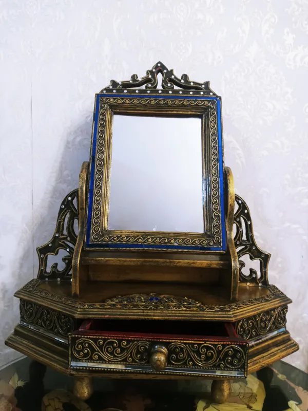 میز چوبی آینه دار دکوری تمام گره چوبی و آینه کاری شده ساخت تایلندیک کشو کوچیک دارد طول 40 سانت و ارتفاع 52 سانت در عرض13 سانت.کار بی همتا.