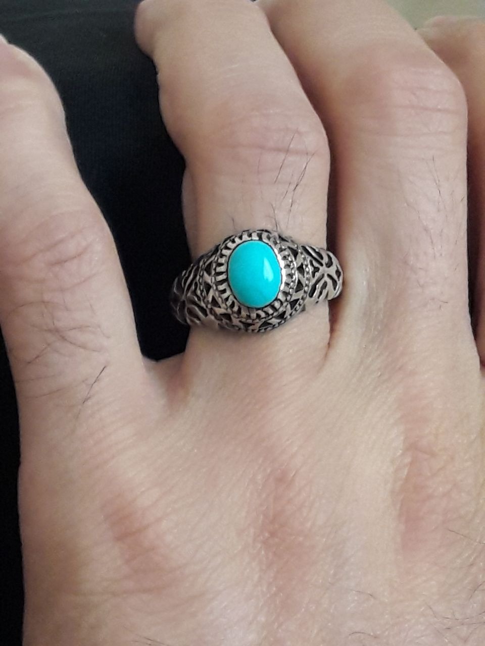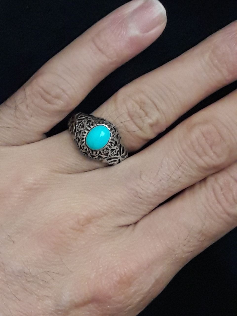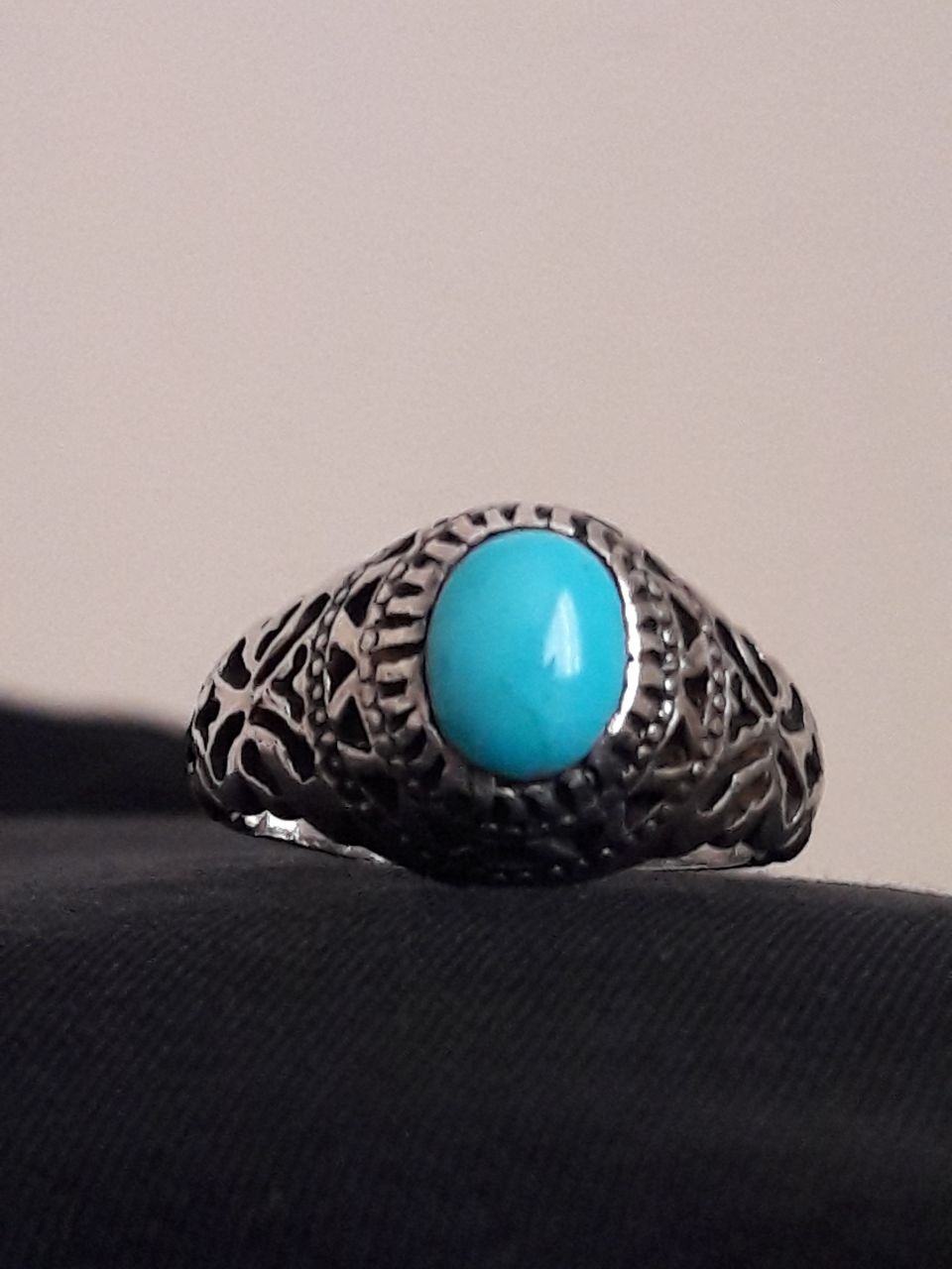 انگشتر فیروزه پاک و کهنه نیشابور بدون احیا با رنگی فوق العاده رکاب تمام اره کاری شده قدیمی سنگ و رکاب فابریک