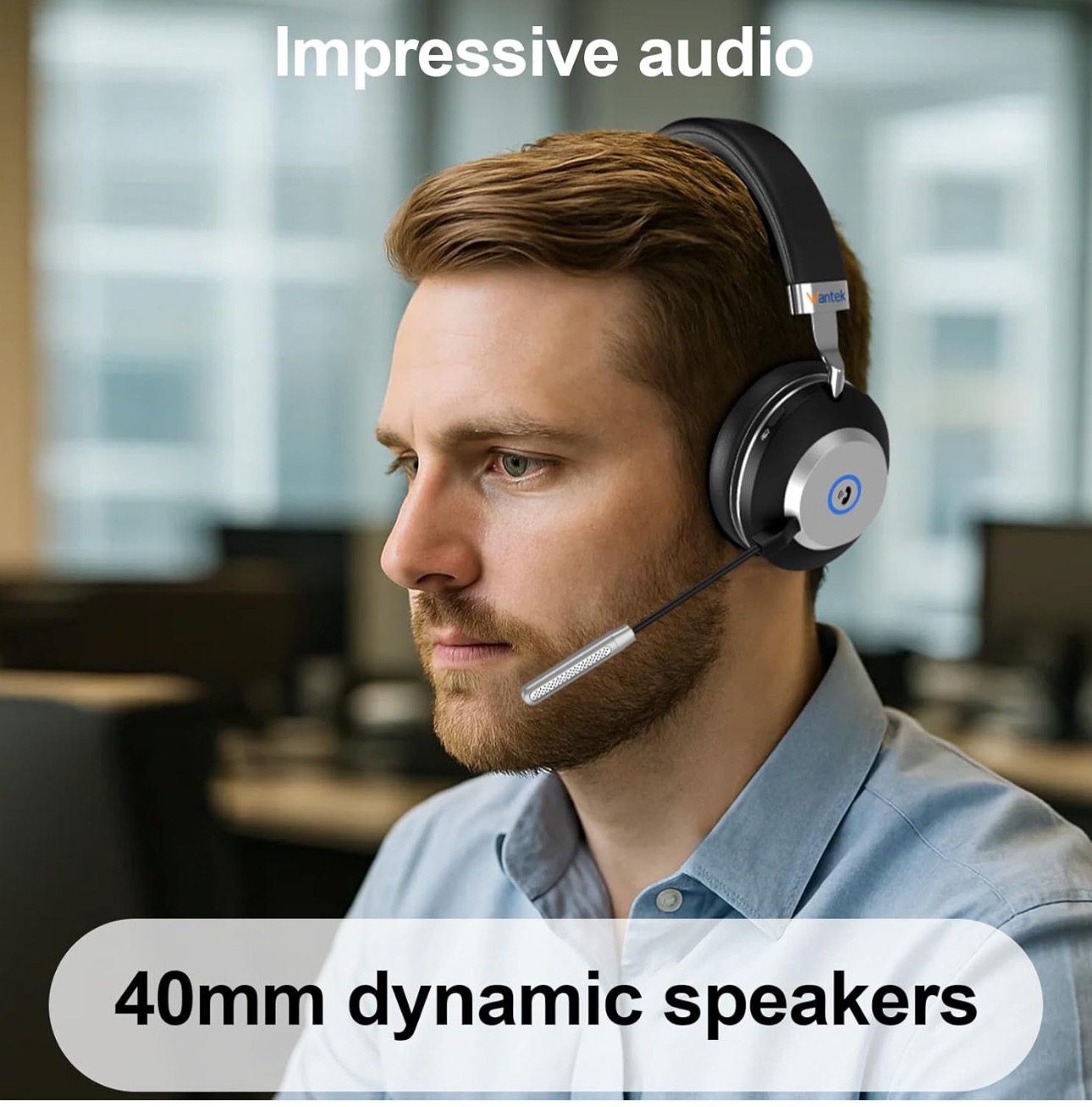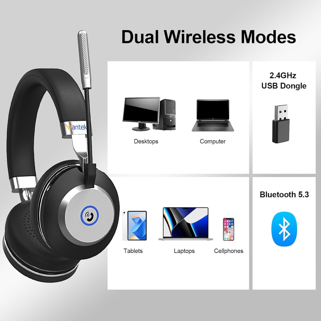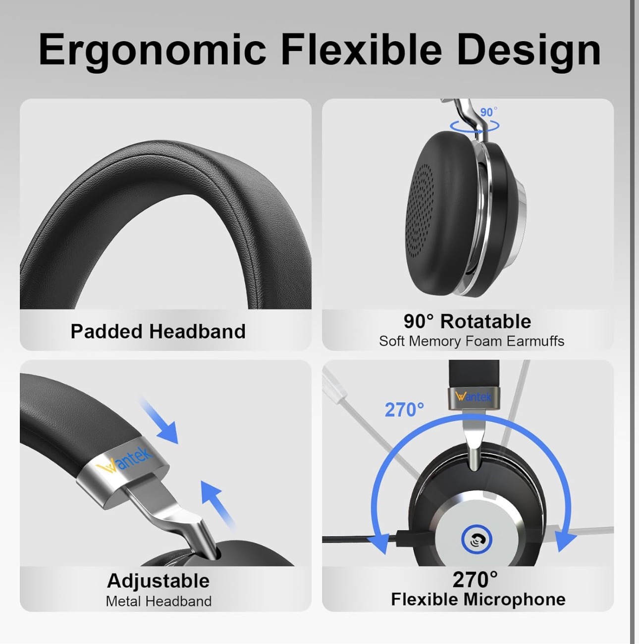 هدست بلوتوث بیسیم Wantek با میکروفون حذف نویز و دکمه بیصدا برای تماسهای کاری و جلسات، تیمها، زوم، اسکایپ، 45 ساعت پخش برای کامپیوتر و تلفن