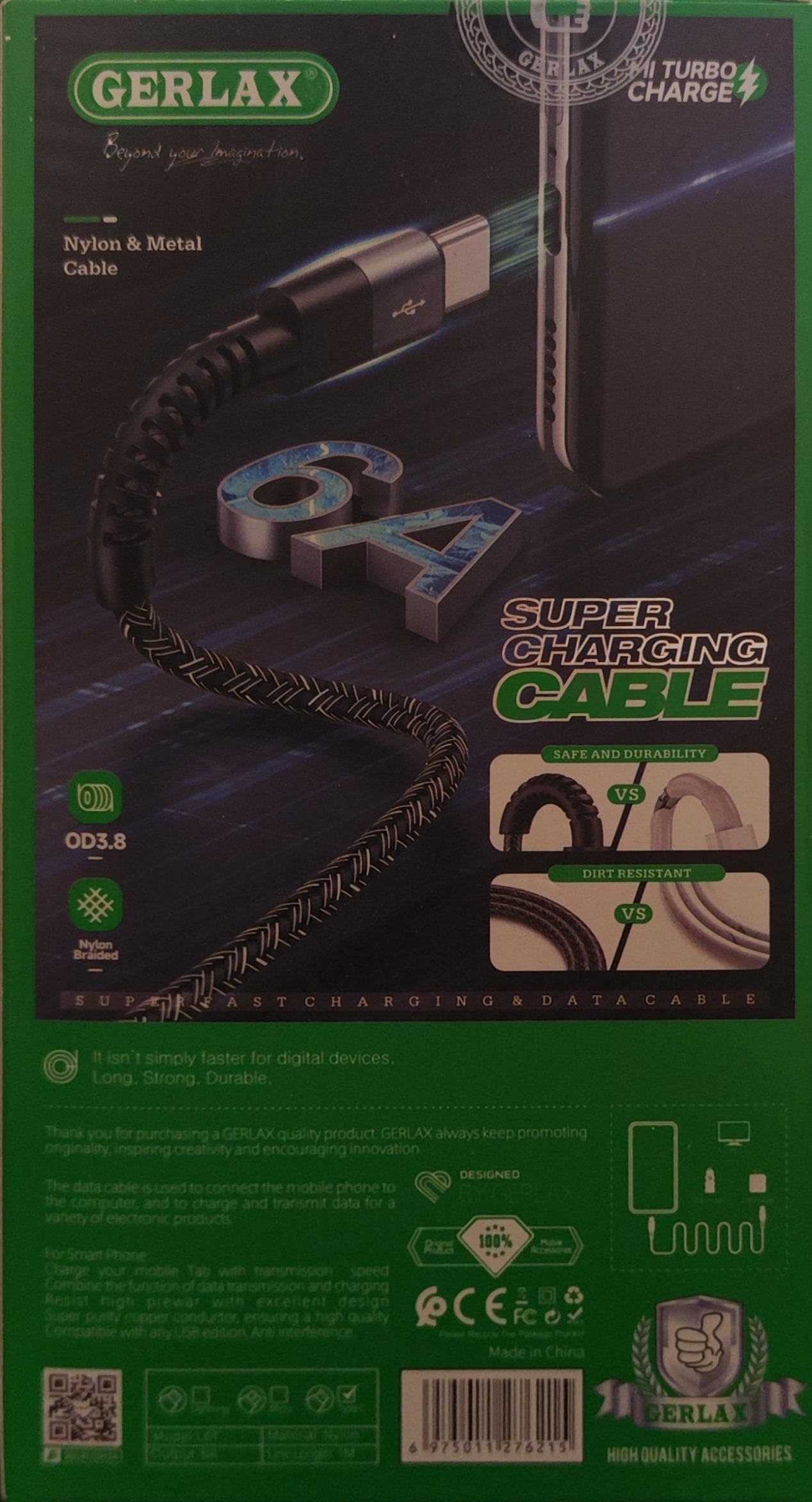 کابل شارژر Gerlax مدل L6T کنفی 6آمپر 100وات