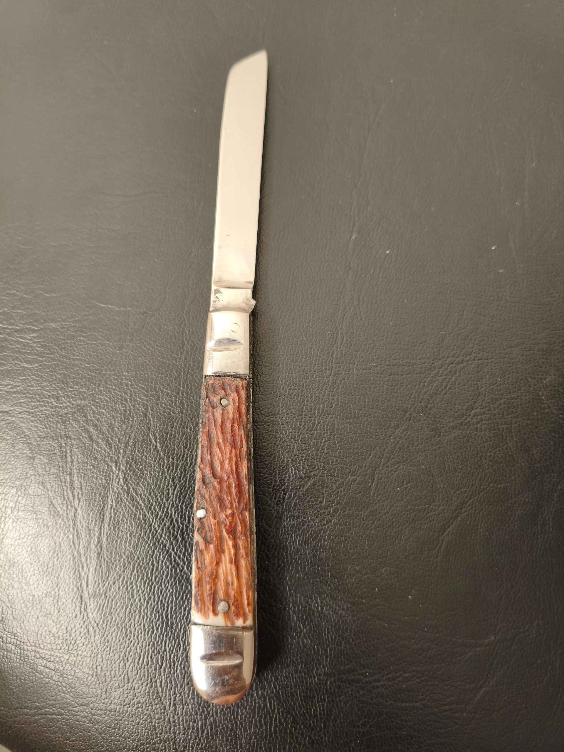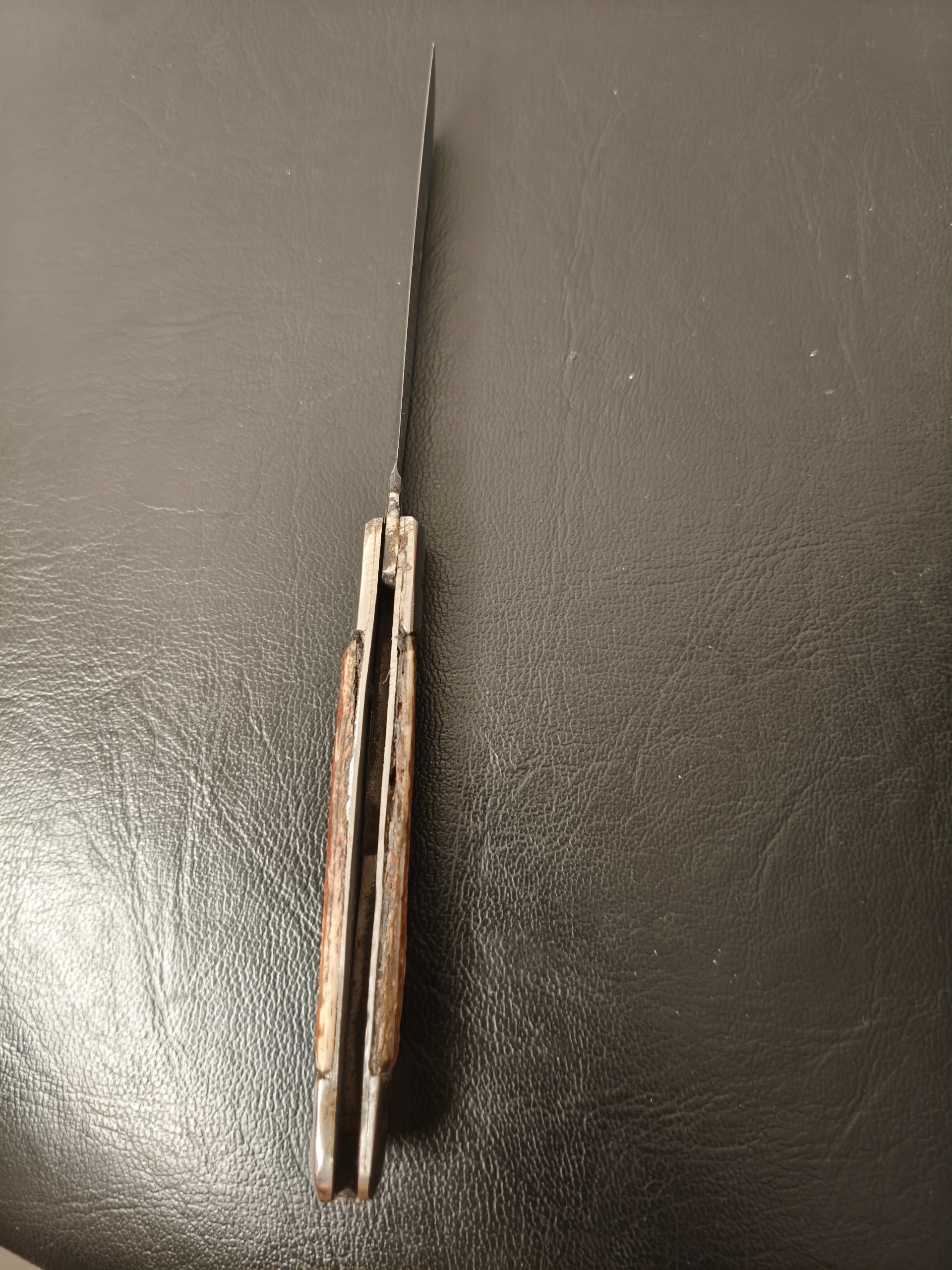 تیغهی این چاقو از **نقره با ترکیب فلزات سخت سنتی اصفهان** ساخته شده و دستهی آن از **شاخ آهو** تراش خورده است؛ جنس طبیعی و خاصی که در گذر بیش از یک قرن، همچنان استحکام و زیبایی خود را حفظ کرده است.