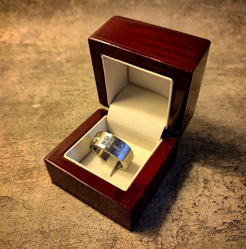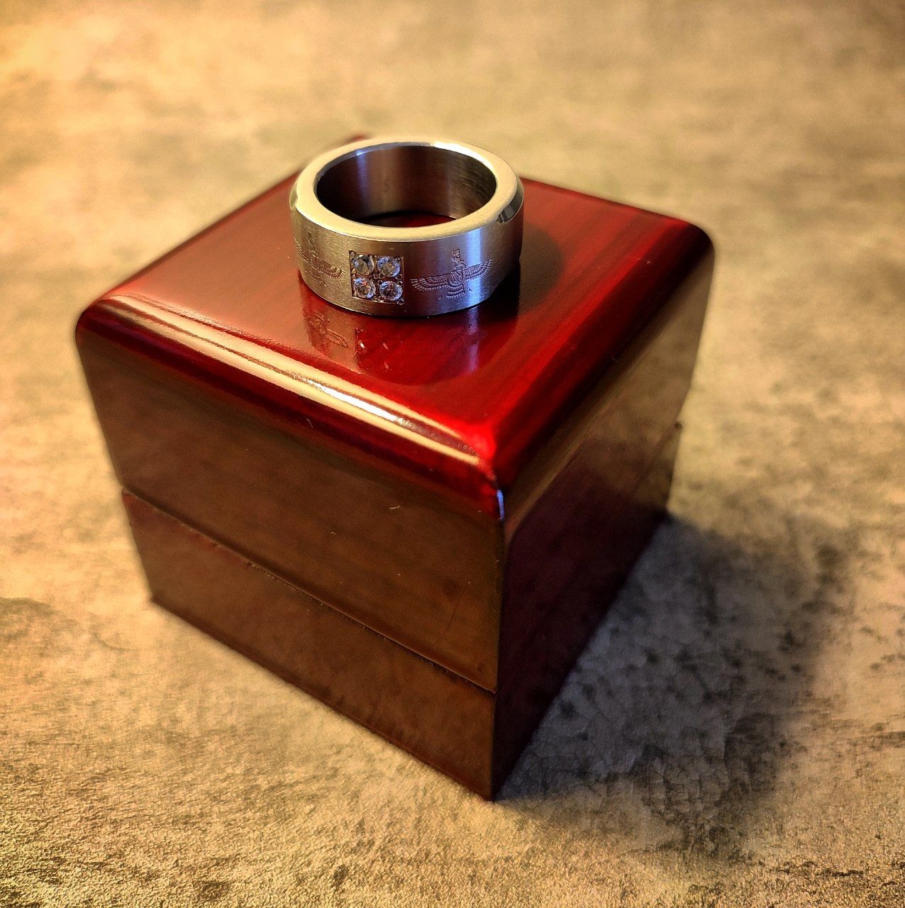 حلقه استیل ایتالیایی مردانه با طرح فروهر نگین دار