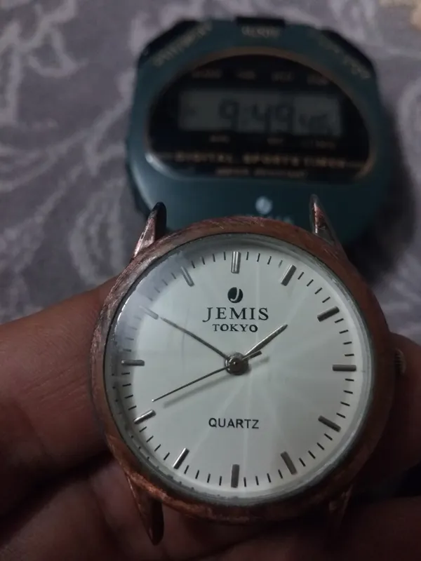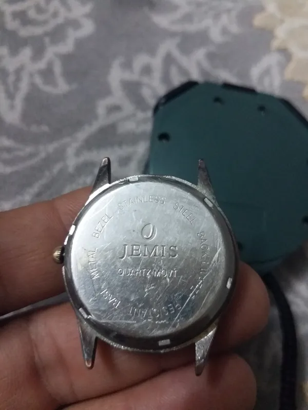ساعت مچی JEMIS عقربه ای باتری خور کاملا سالم کار میکنه بدون بند و باتری هست که به عنوان اشانتیون میدم
