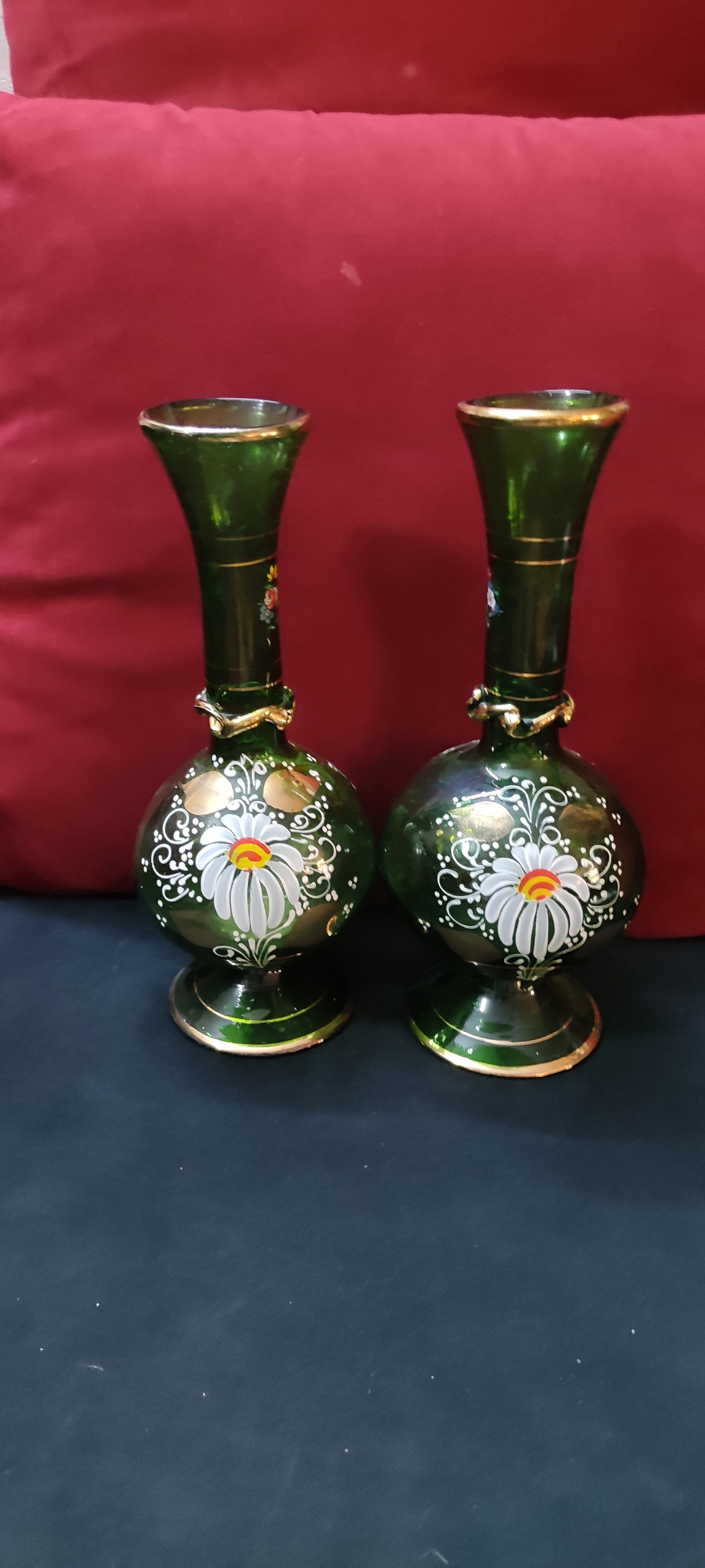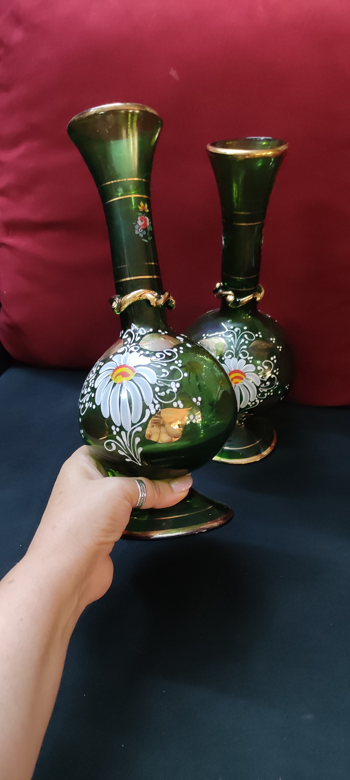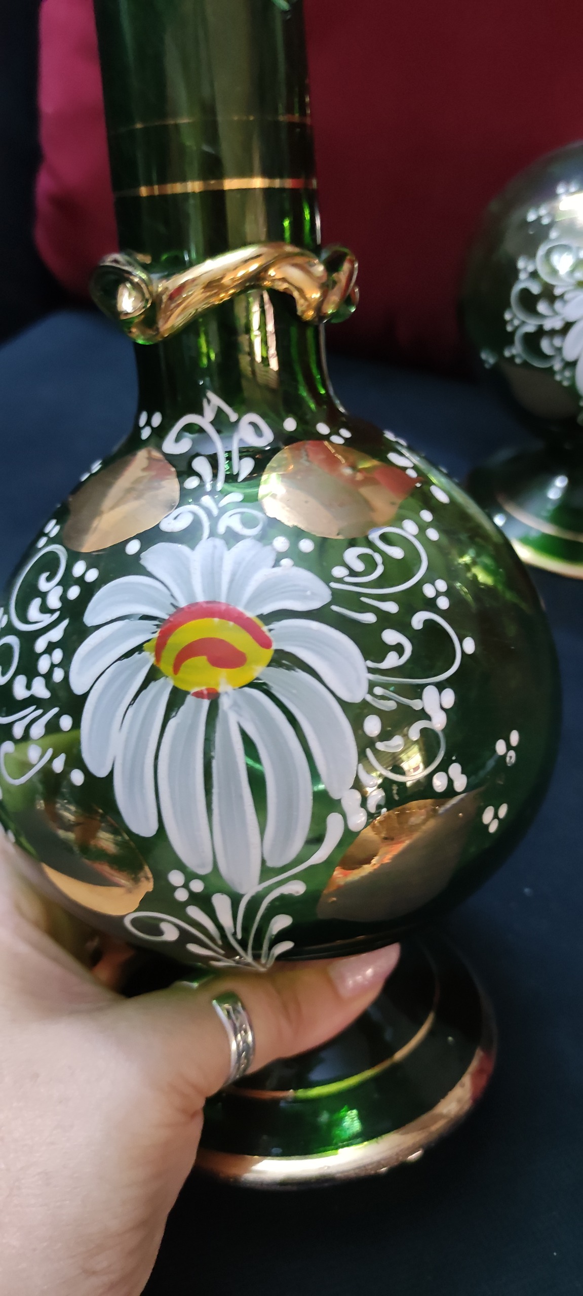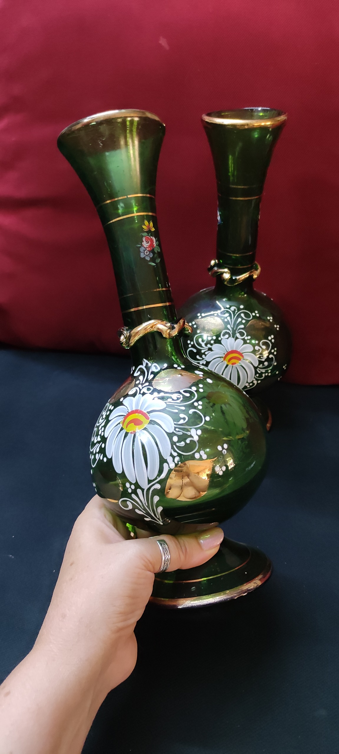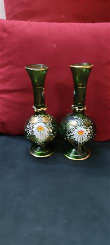 گلدان سبز سایز بزرگ آنتیک قدیمی ، کمیاب و کلکسیونی پر از گل و طلاکوبی و نقاشی